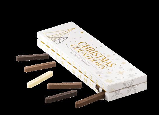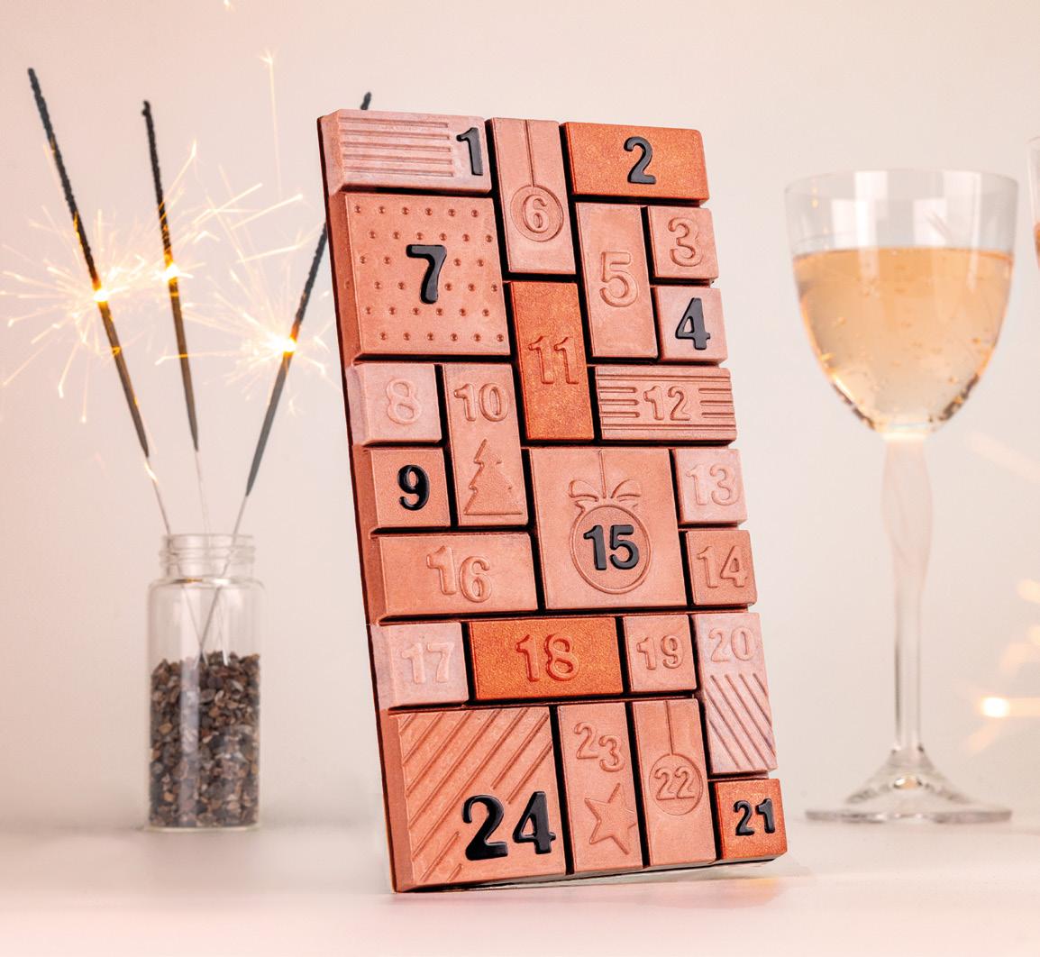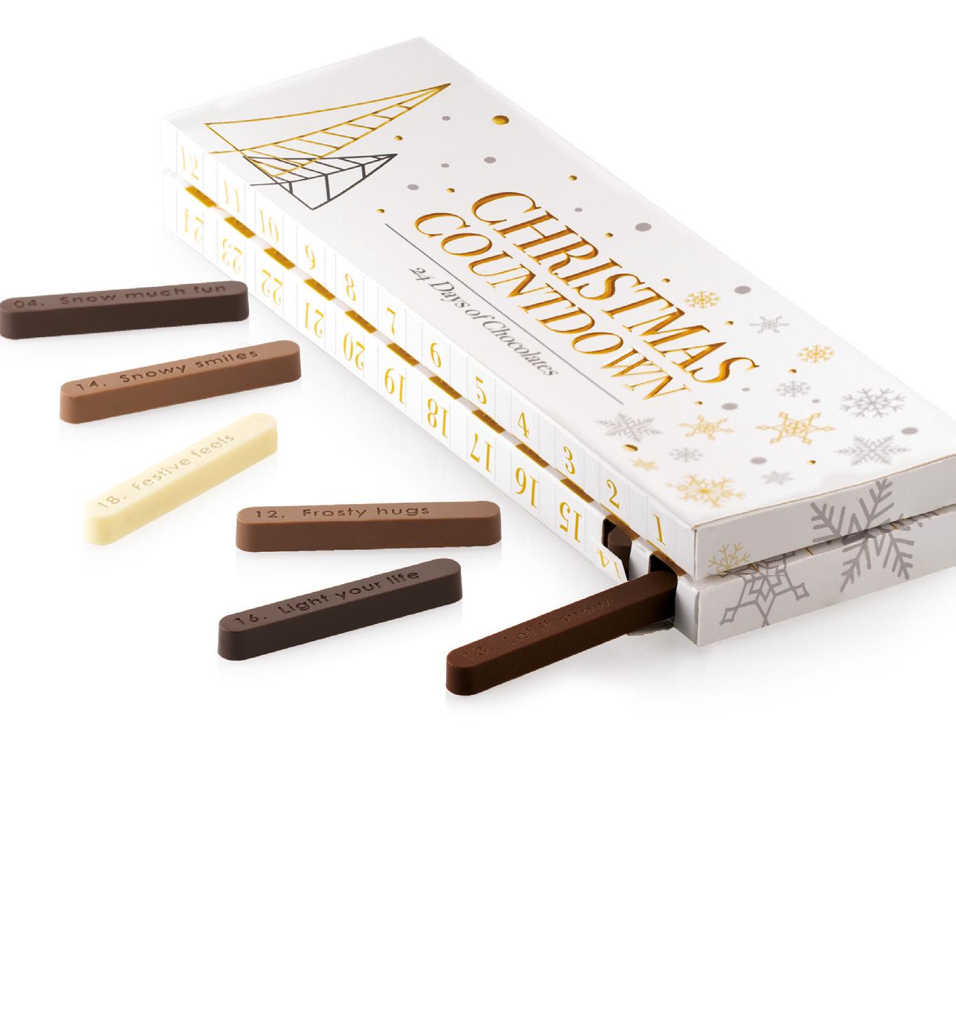 Christmas Countdown è il kit Chocado by Silikomart Profes sional che permette di realizzare il calendario dell’avvento. Il set è composto da uno stampo in Tritan con cui realizzare 24 cioccola tini con frasi a tema in inglese e da un’elegante scatola contenente due supporti in termoformato per una disposizione ottimale dei cioccolatini. Christmas Countdown è un modo per ren dere ancora più memorabile l’attesa del Nata le, riscoprendo il piacere donare qualcosa di unico e fatto a mano.