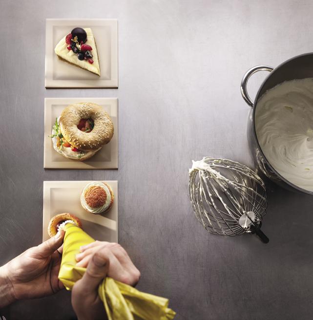 Per quanto riguarda il cremoso montato, è bene impiegare una copertura fondente (60/70%). La presenza di burro di cacao qui diventa un vantaggio perché, con l’estrat to secco di cacao, conferisce maggiore stabilità all’insieme. Una struttura più solida consente infatti di montare il composto in planetaria e il cremoso risulta quindi molto