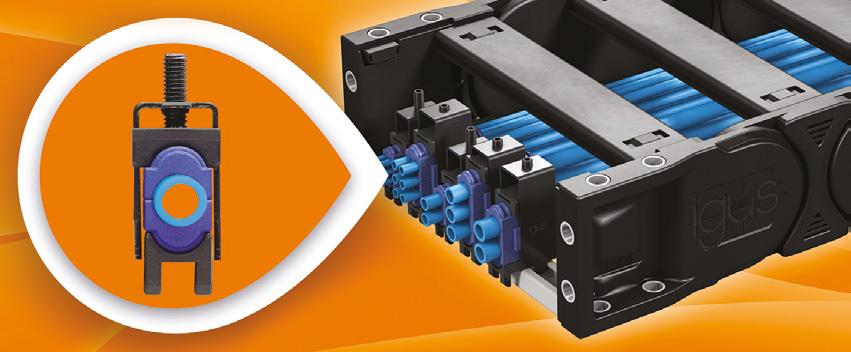 del morsetto tocca la parte inferiore, viene raggiunta automaticamente la forza di te nuta ottimale. Il tubo rimane così corretta mente e saldamente fissato in posizione e non è più necessario perdere tempo in lun ghi controlli sulla coppia di serraggio. Questo meccanismo permette anche di evitare i danni al tubo, causati da eccessiva pressio ne. Per rendere questa tecnologia disponi bile per il maggior numero possibile di tubi pneumatici, Igus realizza controselle blu in diverse misure. Gli inserti, che prima erano realizzati tramite stampa 3D, vengono ora stampati ad iniezione e sono disponibili in versioni per cavi di diametro 4, 6, 8, 10 e 12 millimetri. Inoltre, per ottimizzare lo spazio utile, è possibile disporre due tubi con diametri di 4 e 6 millimetri, uno a fian co dell’altro, con un’unica controsella, per consentire a un solo morsetto di accogliere fino a dieci tubi.