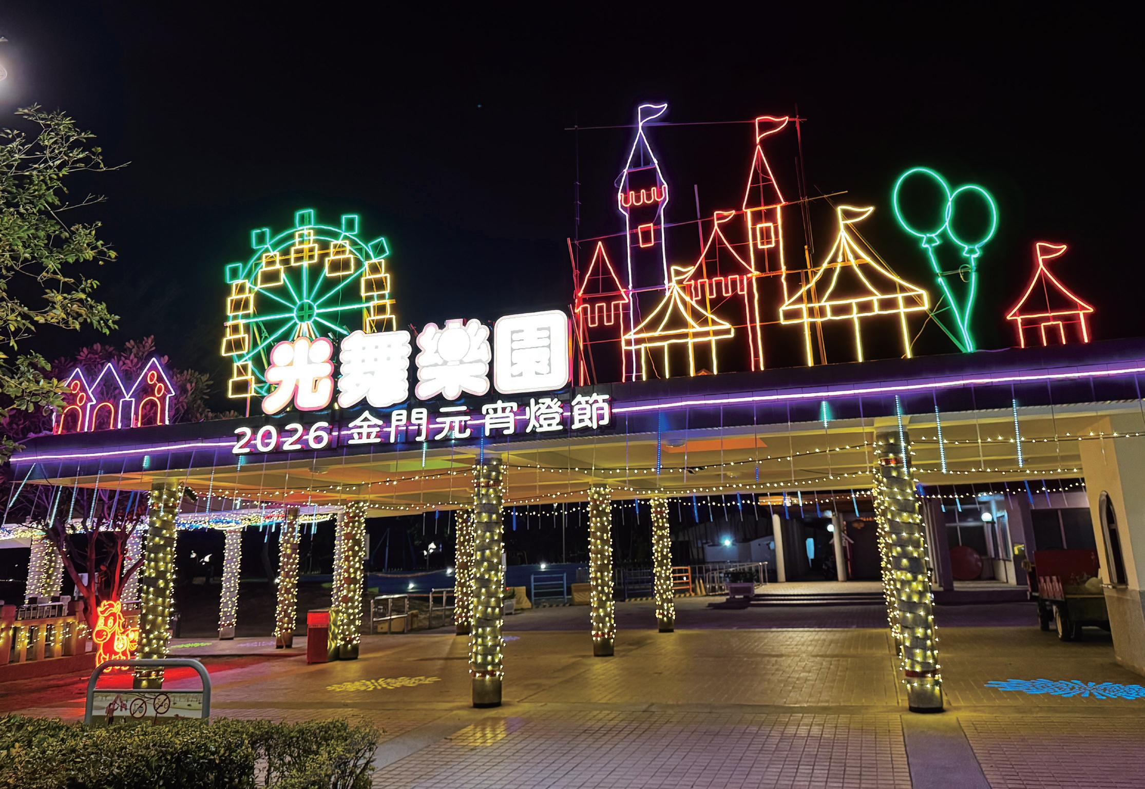 一年一度的金門元宵節盛事再度點亮夜空。由金門縣文化局主辦的 「2026 金門元宵燈節」,以「光舞樂園‧馬躍金門‧慶元宵」為 主題,自 2 月 6 日起在金城鎮莒光共融公園點燈展出,透過主題燈組、 光影藝術與科技互動裝置,打造充滿童趣與文化意象的夜間節慶空 間。活動自春節期間點燈以來,吸引不少民眾夜間入園賞燈拍照, 也讓莒光湖畔成為春節與元宵期間最受歡迎的夜遊景點之一。