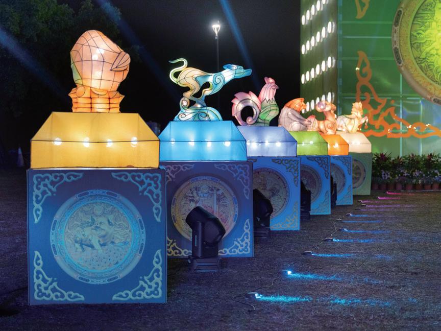 主燈周邊同時設置 12 座生肖小玉璽燈 組,形成一條氣勢磅礡的迎賓燈道。夜幕降 臨後,生肖燈組沿著步道綻放光彩,宛如一 條象徵吉祥與祝福的燈光長廊,吸引不少民 眾拍照留念,成為園區熱門打卡景點。