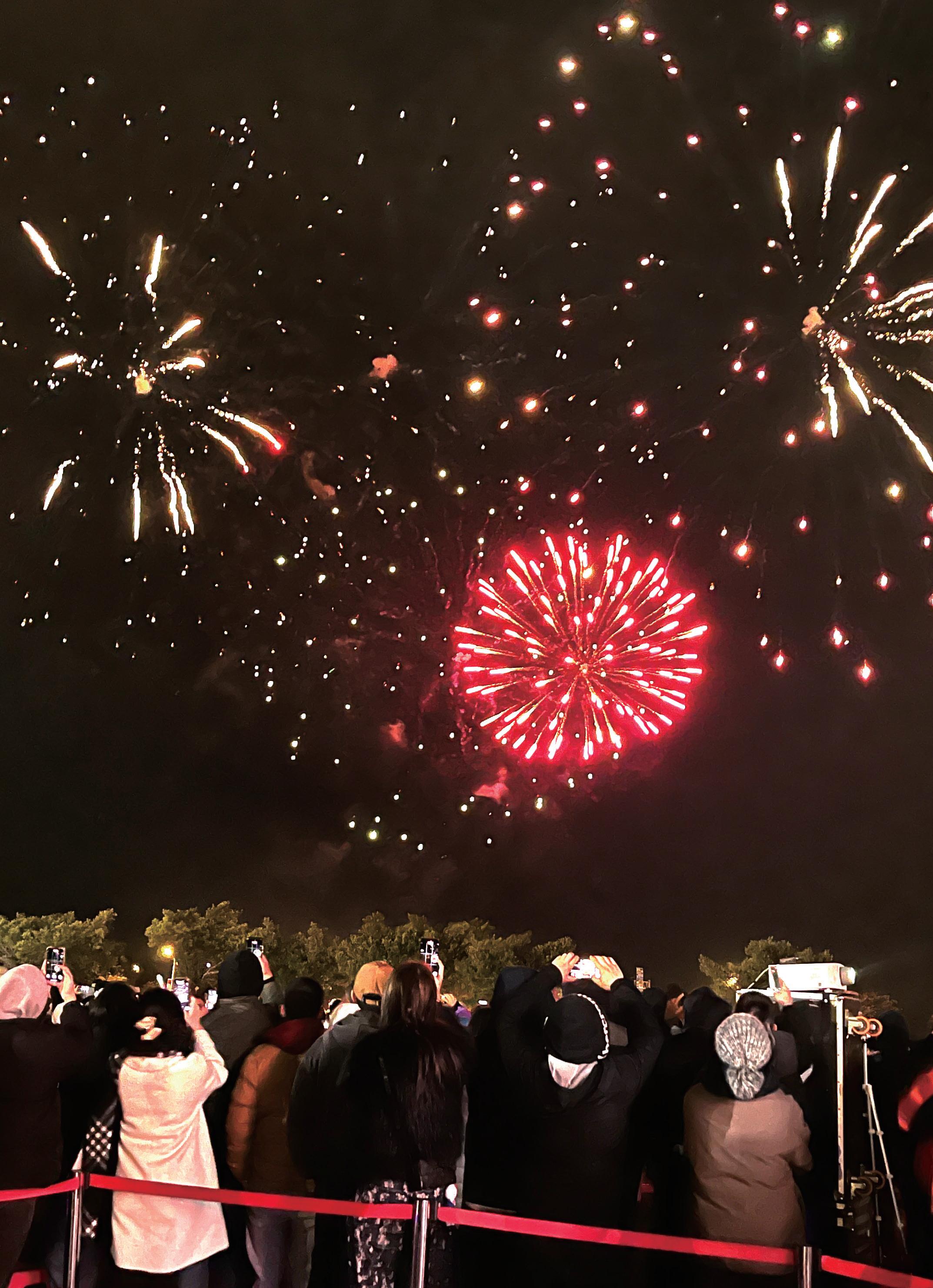 令人振奮的倒數時刻終於到來,這次選 在金城石雕公園施放長達 10 分鐘的高空煙火 秀,包括前縣長楊鎮浯、議員吳佩雯也到場 和鄉親攜手跨年,璀璨煙火搭配舞台燈光效 果,點亮金門夜空,象徵新年的希望與祝福。