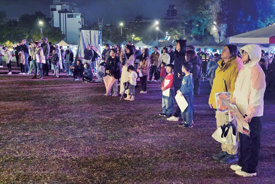 晚在藝文表演與現場民眾倒數聲中,主燈隨著音樂節奏逐 層亮起,璀璨光影映照莒光湖面,讓整個園區瞬間化為流 動的光影樂園,也為金門夜色增添一抹絢麗風景。