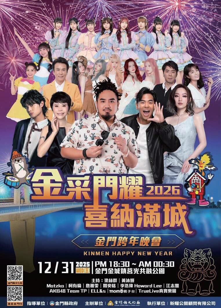 及台灣多位藝人團體來金門唱跨年,為金門 帶來最獨特的晚會表演,並與金門鄉親一起 歡樂迎接 2026 新年。