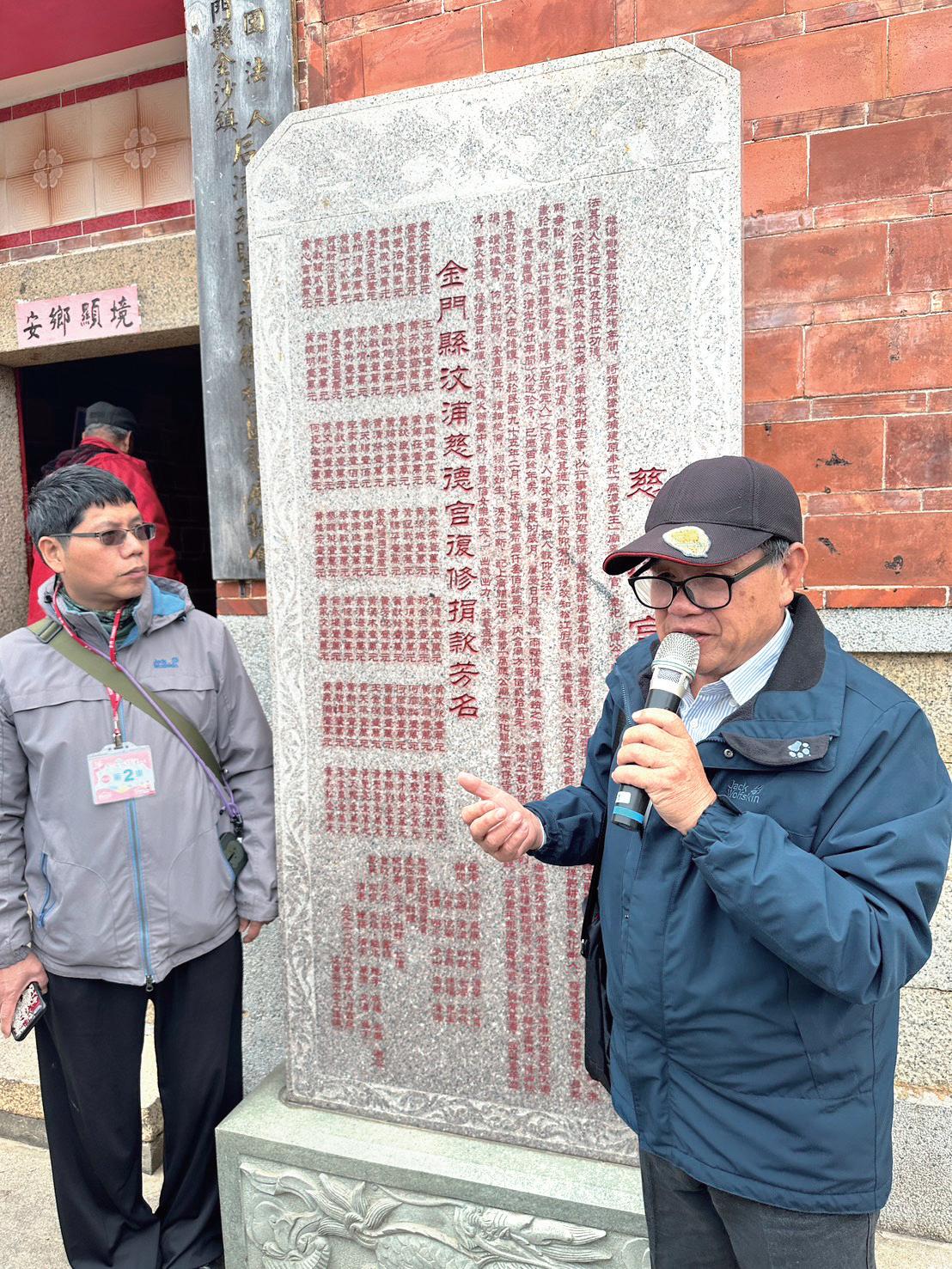 文史工作者陳炳容老師(右 1)站在慈德宮石碑前,說明 慈德宮的歷史及淵源。