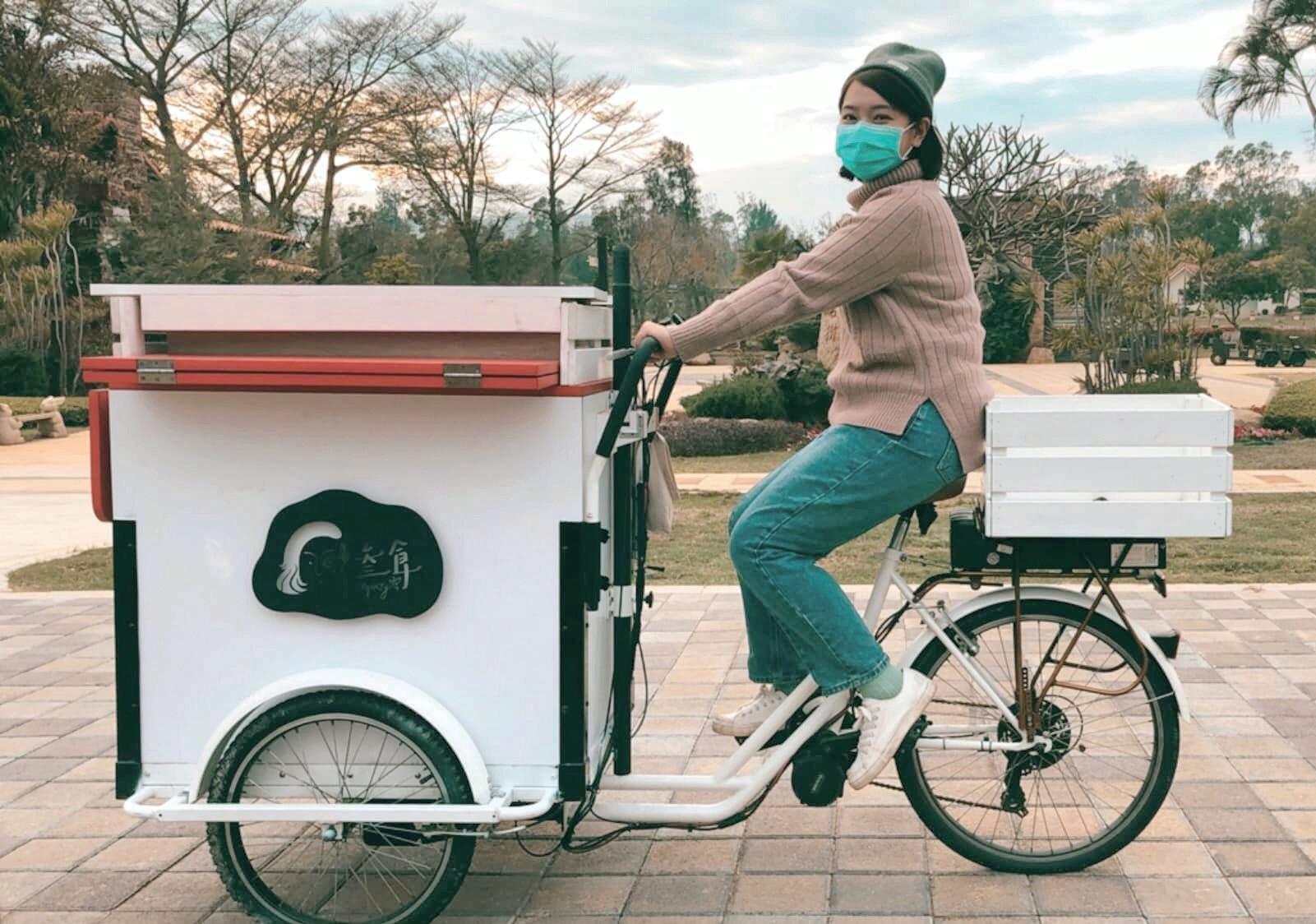 紅色雨傘、復古餐車, 叁 食雞蛋糕穿梭 於金門的大街小巷、市集、校園與活動現場, Kerry 將每一份熱騰騰的雞蛋糕遞到顧客手 中,那裂開外皮、流出的內餡,承載的不只 是香氣,還有她對這片土地的深情。