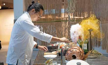 楊偉林大膽地邀請7位不同領域的創作者,包括主 廚張皓福、日本花道家上野雄次、纖維藝術家陳淑燕、 馬來西亞建築師張文婷、結合科技的設計師林沛瑩、日 本染織藝術家山中彩與結合電腦的年輕織品藝術家李偵 綾。這7位創作者從她篩選出的幾十件典藏品中挑選想 要對話的對象,並與自己的專業結合創作。