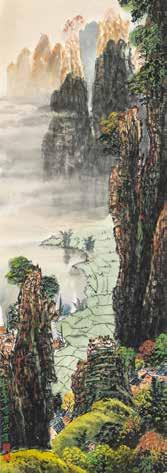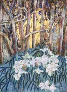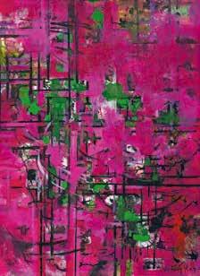 秉持「畫畫與生活兩把刷子」平衡智慧的吳芳鶯 老師,在家庭與創作間展現韌性,參展油畫作品〈桃 紅之迷〉,象徵她從寫實轉向抽象的蛻變。在印度曾 冒險靠近恆河拍攝火葬現場的李春蘭老師,將攝影視 為療癒重男輕女傷痕的出口,透過鏡頭轉化生命傷痕。 笑說女性藝術家常在「夾縫中求生存」的王世慈老師, 擅長將書法現代化,曾創作出遠看像「QR Code」的 作品,近看其實是用隸書寫的李白詩句。 李春蘭展出攝影作品〈雨林中的一抹晴〉