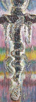 跟侯壽峰老師學膠彩畫時,曾因顏料價格太貴,跟老師去買豬血跟石灰混 合,成了最原始的膠劑,再加入各種顏色成為作畫顏料。作畫時用畫刀在畫布 上厚重地堆疊、刮抹。早期的一幅「懷古」佛像畫,色澤沈穩、力道渾厚,呈 現出如岩石般的粗獷肌理與層次。這幅保存至今的畫作,連木框都是自己做, 展現十足接地氣的庶民藝術風格。
