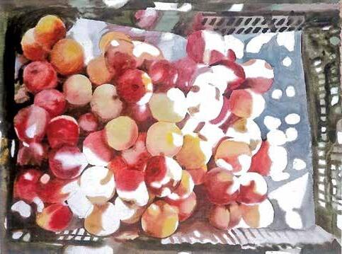 此畫背景為臺中市中區中山路上第二市場水果攤水蜜桃的 光影。在陽光照耀下,畫面錯落有致的光影中,桃紅色水 蜜桃畫面,訴說一種美學上的色彩,水蜜桃在錯落光影中 彷彿隱去了身形,卻因此讓那水蜜桃畫面流露出深深情 意。而疏密有致的水蜜桃和盤面上的光影,使畫面因而有 了韻律節奏。