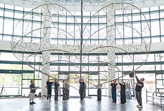 「為了上野雄次老師的作品我 真是費盡心思」楊偉林說,為了找 到符合上野老師需求規格的竹子符 合和花藝材料「木賊」,她動用許 多人脈和方法,最後才順利把那10 支10公尺長的竹子運送到纖博館, 讓作品得以順利完成。這些解決各 種困難與溝通過程,是策辦這個展 覽最驚險也最有趣的挑戰。
