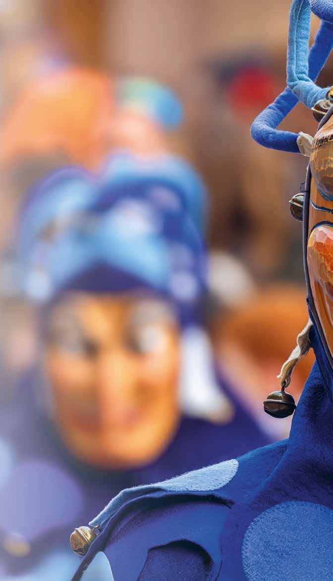 e F a s thcan ›› Stachi und Morbili, Jokili, Spättli, Bobbele, Teufel und Hexen tummeln sich alljährlich um das siebte Wochenende vor Ostern in den Straßen und Gassen der REGIO. Dann erreicht die schwäbisch-alemannische Fasnet ihren Höhepunkt. Handgeschnitzte Masken, kunstvolle Gewänder, aufwändige Materialien – jeder Ort hat seine eigene Tradition. Die Fasnet ist gelebtes Brauchtum und gehört seit 2014 zum immateriellen Kulturerbe Deutschlands.