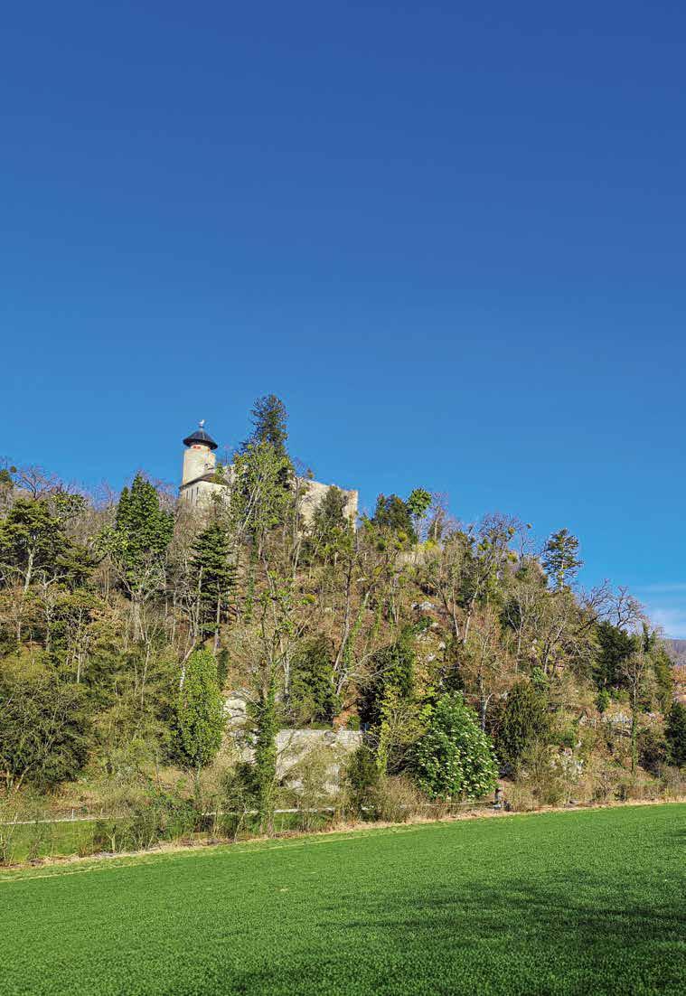 „O BEATA SOLITUDO, O SOLA BEATITUDO“, steht in kapitalen Lettern auf einem weißen Kalkfelsen inmitten der Ermitage. Am Fuß des Felsens liefert eine Infotafel die Übersetzung der vor über 200 Jahren entstandenen Inschrift: „O glückliche Einsamkeit, o einzige Glückseligkeit.“ Tatsächlich gehört mitunter ein wenig Glück dazu, die Sehenswürdigkeiten im weitläufigen Gelände alleine und in Ruhe genießen zu können. Der größte englische Landschaftsgarten der Schweiz ist zu allen Jahreszeiten ein Besuchermagnet. Die Ausflügler verteilen sich allerdings auf ein Labyrinth aus verschlungenen Pfaden, Höhlen und Felsentreppen auf dem Burghügel sowie auf die Spazierwege rund um die künstlich angelegten Weiher in der Talsenke.