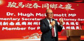 新州众议院议员、律政厅副厅长 Hugh McDermott 在晚宴上致词,向台 湾社群致以新年祝福。他首先赞扬澳洲 台湾同乡会不仅服务台裔社群,也积极 促进澳洲社会的交流与友谊,为社区发 展作出贡献。他特别提到同乡会在推广 华语教育方面所发挥的积极作用,并表 示看到相关教育项目不断发展令人感 到鼓舞。近期,台湾华语文学习中心 (TCML)雪梨台湾学校及雪梨西北中 文学校相继揭牌成立,他期望这些机构 未来能够持续发展壮大,为更多学生提 供了解和学习华语的机会与平台。