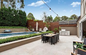 穿過客廳來到私人後花園,後院以修剪 整齊的樹籬為界,波光粼粼的鹽水泳池營造 出一個寧靜的休憩之所。