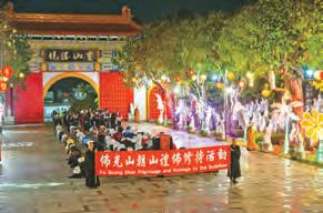 16日晚間10時,除夕朝山自不二門 啟程,200人參與,經靈山勝境朝禮 至大雄寶殿回向,心保和尚帶領恭讀 佛光山開山祖師星雲大師〈除夕祈願 文〉。
