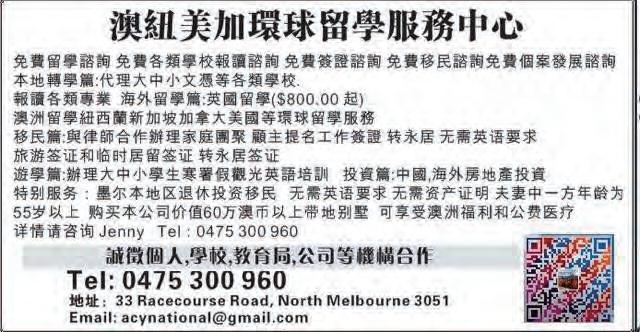★免費留 學諮 詢★免費報 讀學 校諮詢★免費簽 證諮 詢★收費個 案規 劃諮詢 本地轉學篇:代理大中小學文憑學位各類學 校,報讀大學基礎課直升大學一年 級,報讀大學文 憑 課程直升大學二年級,幼教一年的文憑課程是移民的熱門課程,解決學生出勤率不夠等簽證問題 海外留學篇:英國留學($1500起)。澳洲、新西蘭、新加坡、加拿大、美國等國環球留學服務 遊學篇:辦理大中小學生寒暑假觀光英語培訓 工作簽證:打工度假簽證、轉工作簽證,與移民代理合作 永居簽證:旅遊簽證、457工作簽證轉永居,家庭團聚、雇主提名、配偶簽證轉永居簽證 特別服務:學生簽證等臨時居留簽證、投資商業轉永居,免年齡限制,免英文要求 詳情請電Jenny電話或微信 0475300960