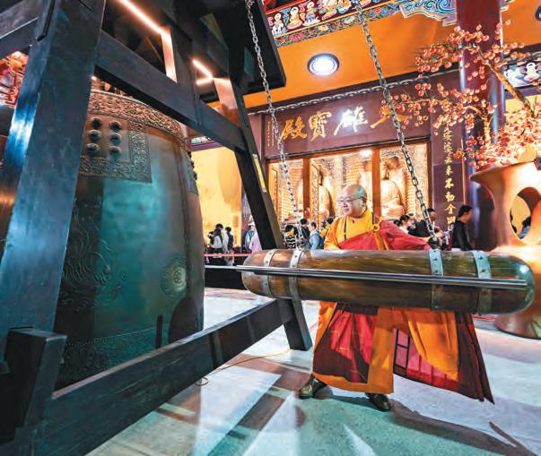 ⬆隨著大雄寶殿重啟,殿外也恢復叩響平安鐘,由佛光山住持心保和尚率先 叩鐘,在誦念〈叩鐘偈〉中叩鐘祈福。