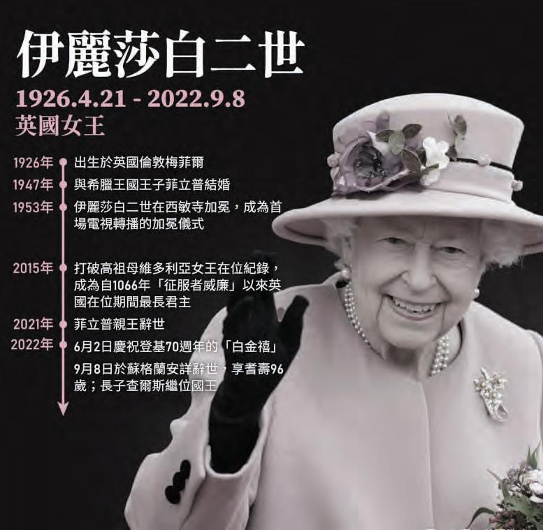 2022年9月8日,英國女王伊麗 莎白二世(Elizabeth II)去 世,終年96歲。之後,她的長子、王 儲查爾斯繼承王位。 伊麗莎白二世是英國歷史上在位 時間最長的君主,被稱為“現代英國 的基石”。 9月19日,英國舉行盛大國葬, 世界各地500多位政要齊聚倫敦,向女 王致以最後敬意,也為一 個時代畫上句號。 伊麗莎白二世經歷 了英國後帝國時代的結構 性轉變,見證了英國的興 衰起伏。她在位的最後幾 年,英國因為“脫歐”和 歐盟關係緊張,貿易戰一 觸即發。 這兩年英國政壇更 是醜聞頻出、動盪不已: 前首相約翰遜 因深陷“派對 門”和包庇下 屬醜聞遭逼宮 下台;繼任的 特拉斯實施不 切實際的大規 模減稅計劃, 令英鎊匯率崩 盤、經濟震 盪,也讓自己 成為英國史上 “最短命首 相”,還將自 己此前擊敗的 對手蘇納克送 上首相寶座。 此外,英國還面臨著能源危機、 經濟危機、公共服務危機和分裂危機 等多個挑戰,蘇格蘭獨立呼聲再起, 一些英聯邦成員也加快“遠離”英國 王室的步伐。 伊麗莎白二世被很多人視為“確 定性”的象徵,她的“離去”讓英國 未來何去何從處於未知狀態。 安倍晉三街頭遭槍殺 日本推動修憲及軍力擴張 2. 3. 1. 女王去世兩易首相 英國政壇動盪不安 4. 烏克蘭總統澤倫斯基(Volodymyr Zelenskyy)將俄羅斯對烏克蘭的入侵,比作二戰 期間納粹德國的軍事行動。 英國女王伊麗莎白二世9月8日(英國時間)駕 崩,享耆壽96歲