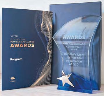 國際佛光會昆士蘭協會,在洛根市 備受矚目的「人民卓越獎」頒獎典禮 上,因其對社區的卓越貢獻,當晚現 場公佈得知榮獲表彰「藝術與遺產獎 類別之文化影響力獎」的殊榮,實感 榮耀!佛光會兩位代表在全場熱烈歡 呼聲與祝賀聲中上臺領獎,由洛根市 Jon Raven市長親自頒發。