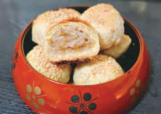 主廚悄悄話 蘿蔔絲豆酥餅為了酥鬆口感,這次沒有 用一般奶油,而是做月餅專用的無水奶油 。如果要遵循古法,其實花生油最能顯現 出中式鹹點的風味,而且吃起來頗為香脆 。一般居家若沒有這些油,拿抹麵包的乳 瑪琳、燒菜的液體油,同樣能做成功。 蘿蔔粥不放素火腿,而改放炒香豆渣末 (可利用豆漿濾料再加工),除了健康營 養之外,更具有飲水思源的美好意涵。