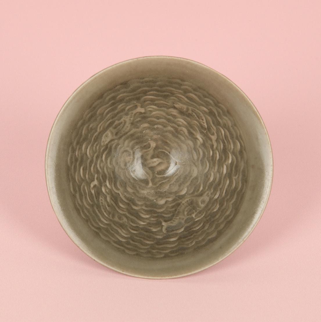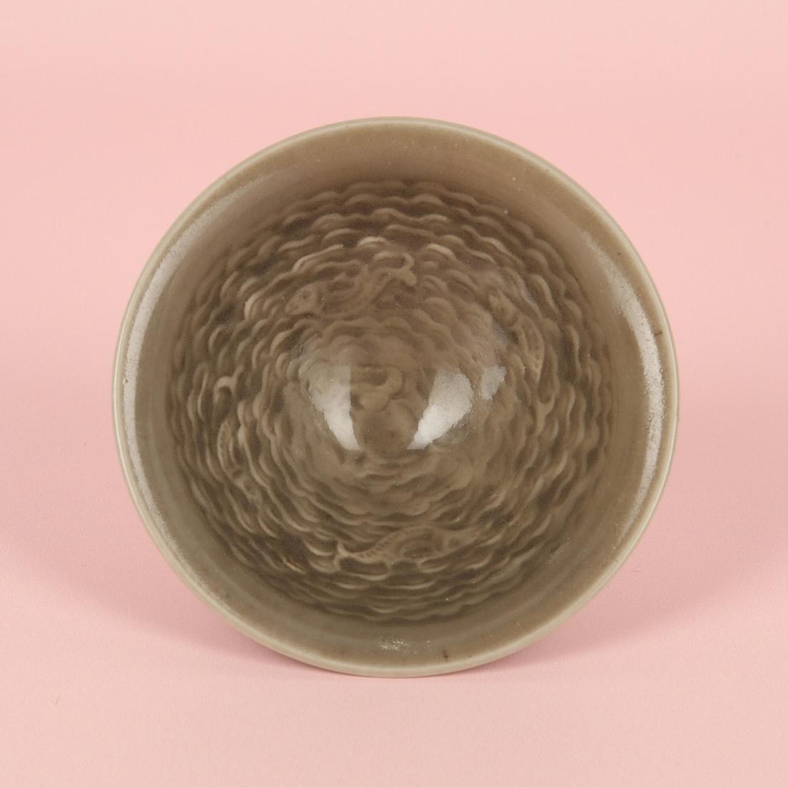 The finely and delicately potted conical bowl with steep rounded sides rising to a gently everted rim, the interior elaborately moulded with four scaly fish swimming amidst dense foaming waves, the centre decorated with a seashell, the exterior with radiating ribbed design, covered overall with a pale olive-green glaze. 10.4cm diameter