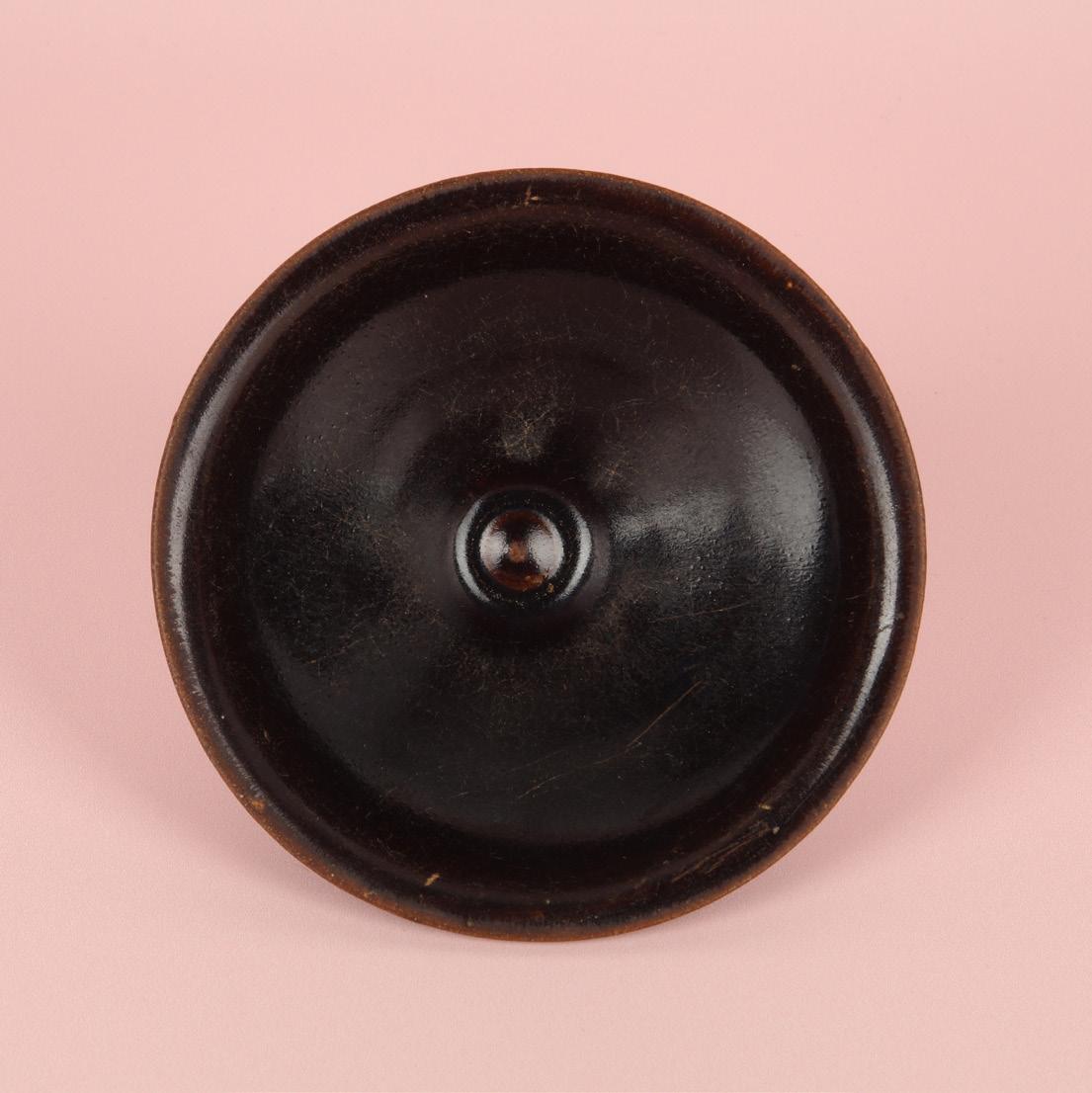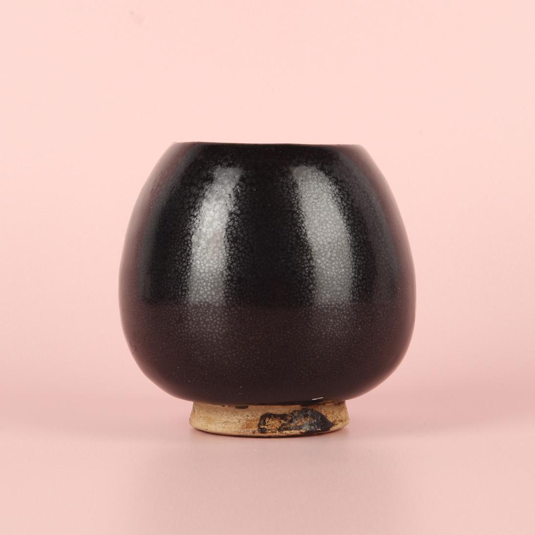 The robustly potted waterpot in the form of a lotus bud with a bulbous body rising from a short foot and incurved rim, overall covered with a glossy black-glaze with 'oil spots', the foot left unglazed revealing the buff body. 9cm high