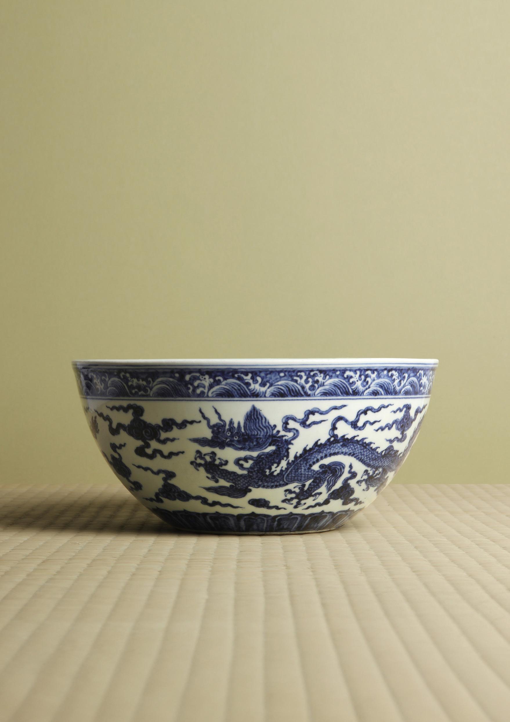 The finely and robustly potted dice bowl, bo, with deep rounded sides and flat-cut rim, well-painted in intense and varying tones of underglaze blue with characteristic 'heaping and piling' on the exterior with two five-clawed dragons chasing one another through stylised ruyi cloud scrolls in mutual pursuit, all between a band of upright lotus petal lappets and a band of cresting waves, the interior painted in the well with a six-character mark in underglaze-blue within a double circle.