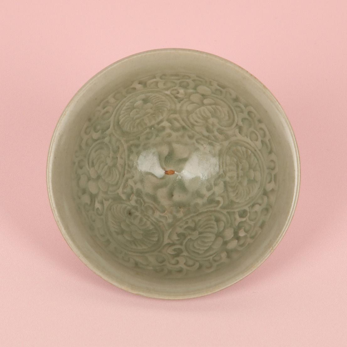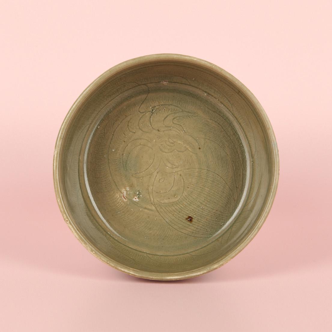 The finely potted bowl of conical form with a slightly everted rim, decorated on the interior with chrysanthemum medallions on a scrolling foliate ground, the exterior incised with radiating lines, covered overall save for the footring in an olive-green glaze. 13cm diameter