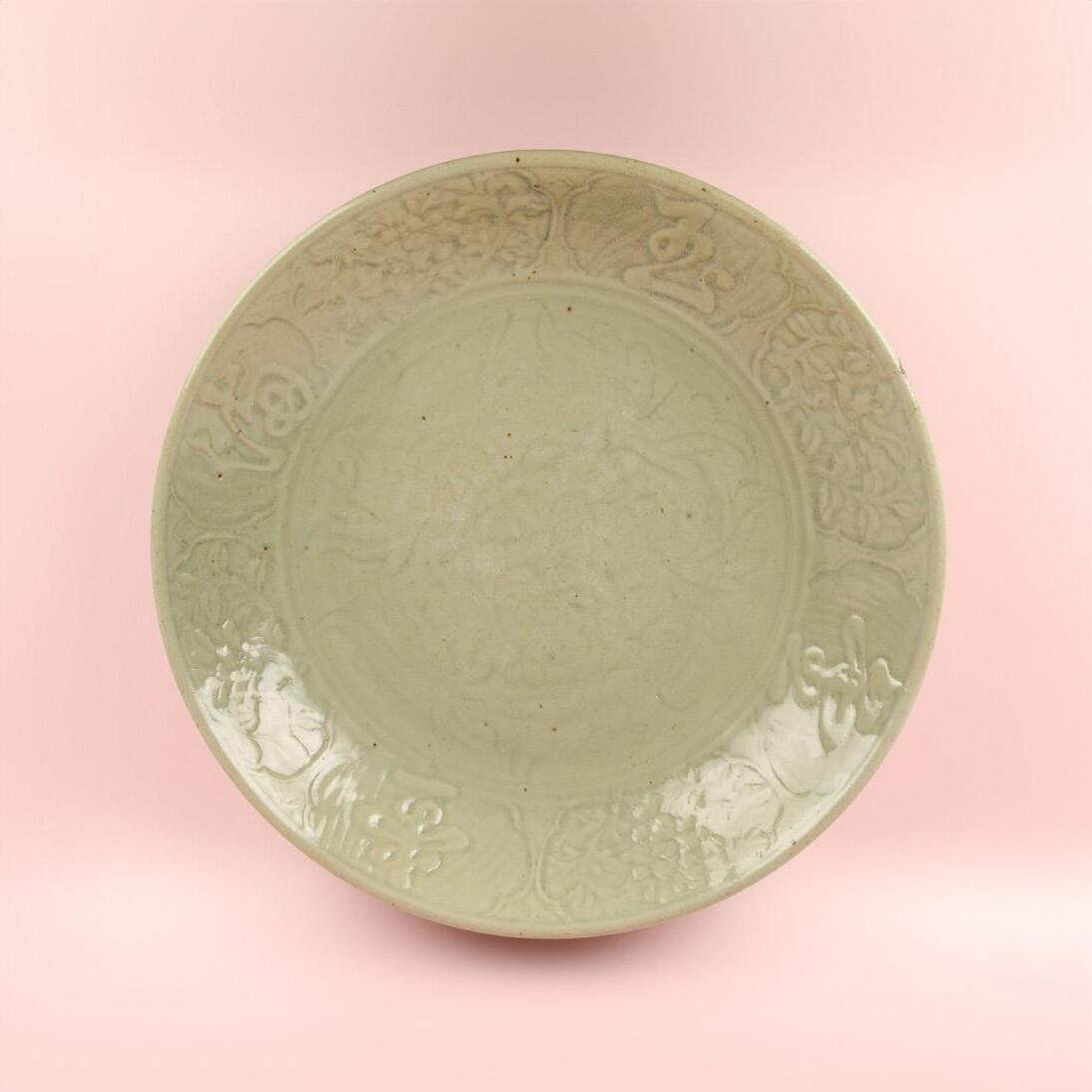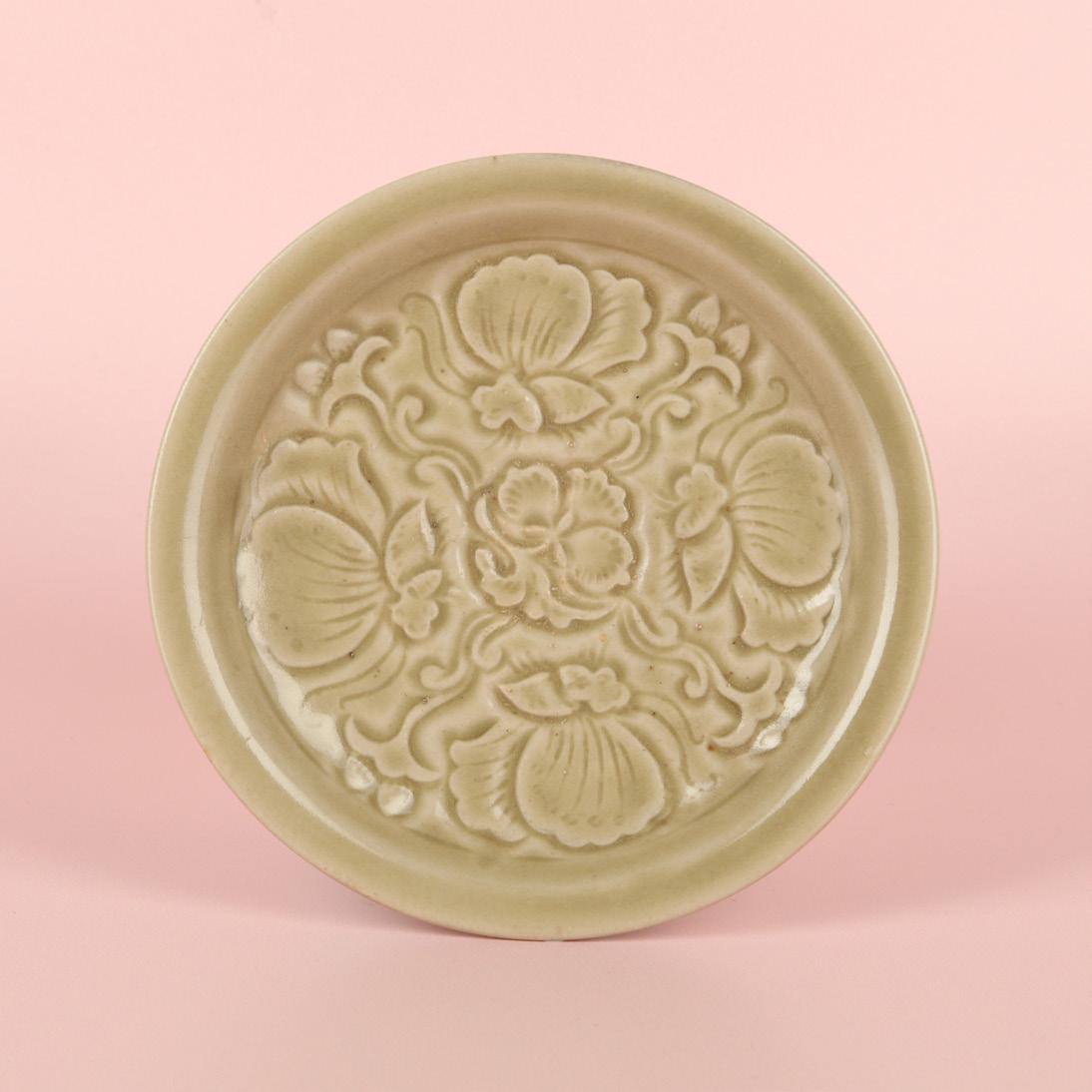 A rare Chinese Yaozhou celadon 'butterfly' moulded dish 宋 耀州窰青釉印蝶戀花紋盤