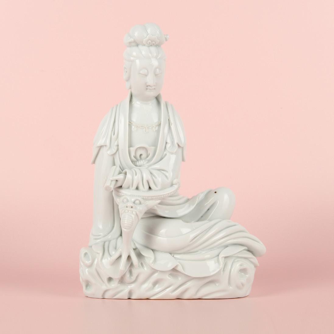The finely modelled figure of Guanyin depicted seated with one leg raised, the left arm raised holding a ruyi scroll, wearing long robes opening at the chest to reveal a beaded necklace, the face with a benevolent expression, the base modelled as a rocky formation. 25cm high