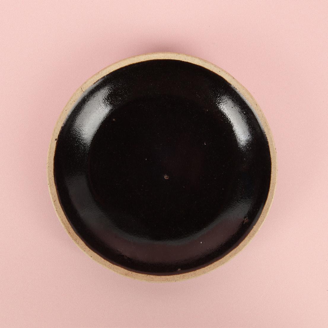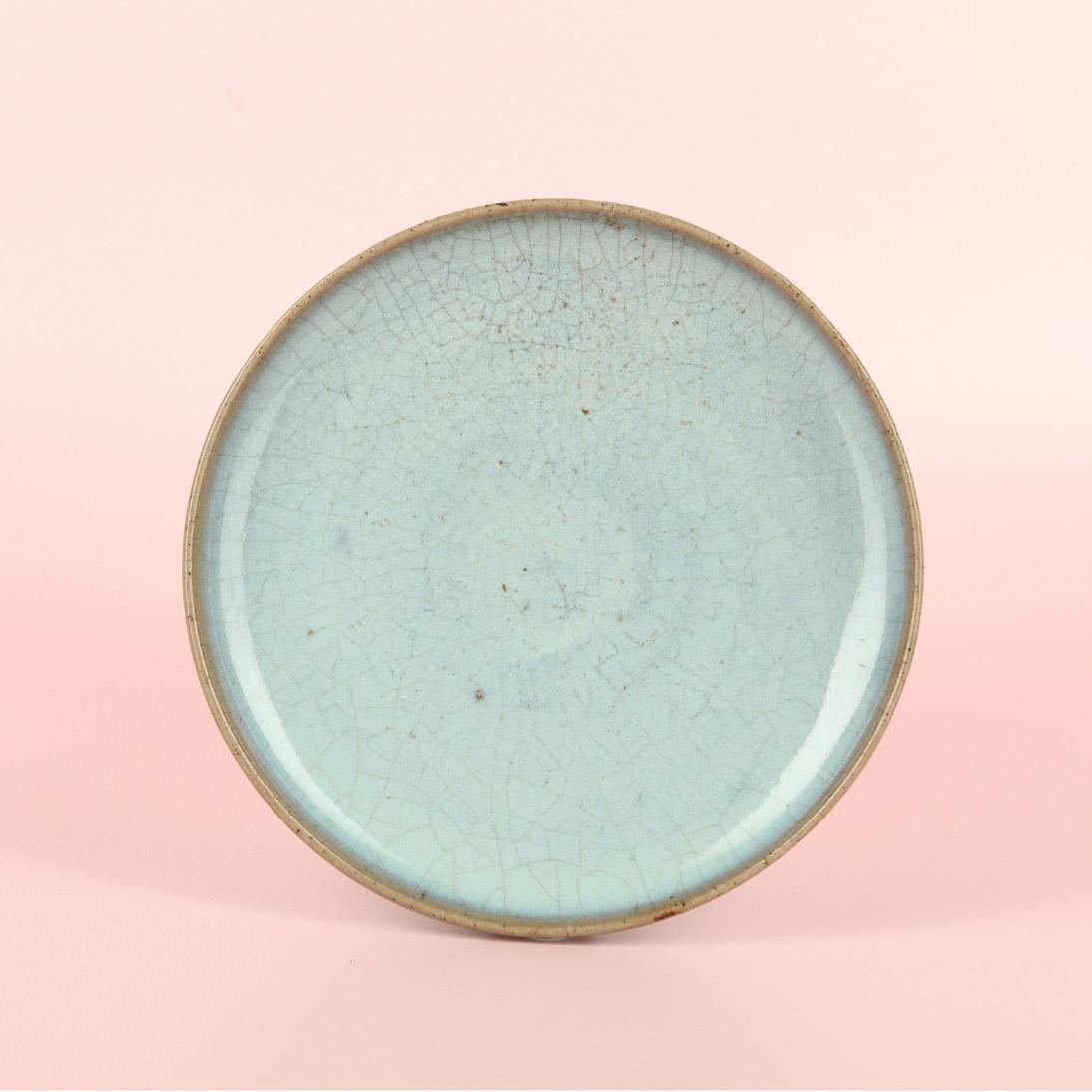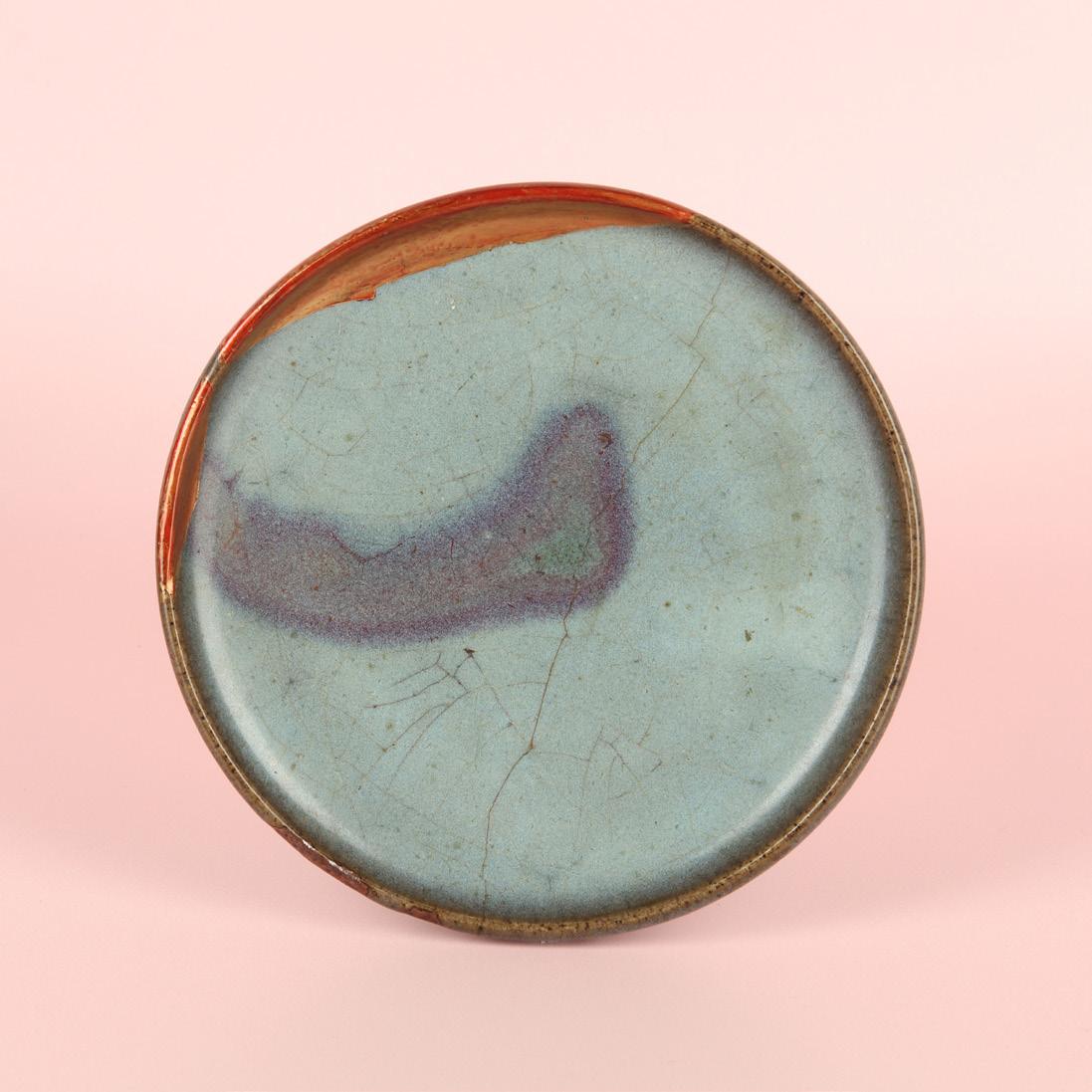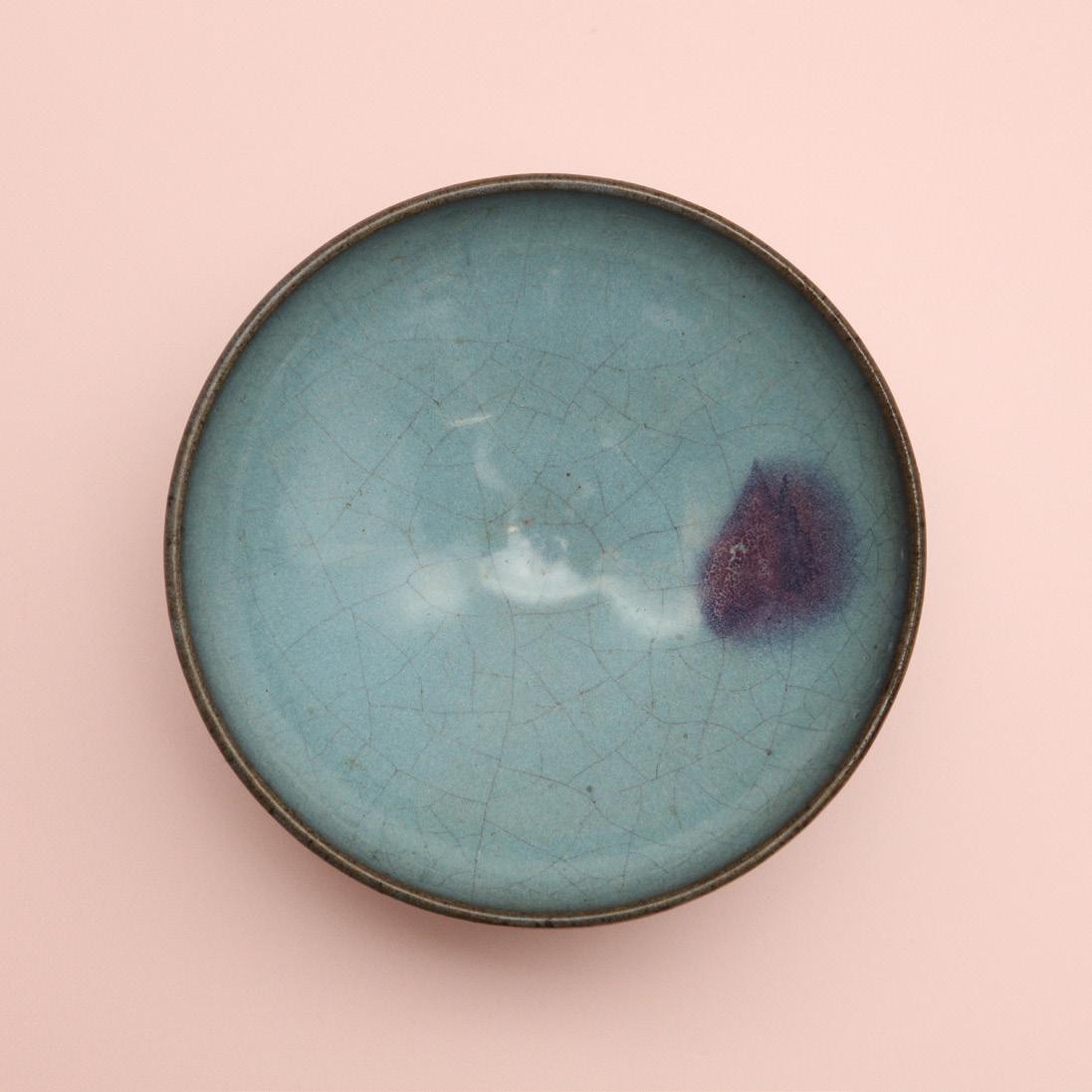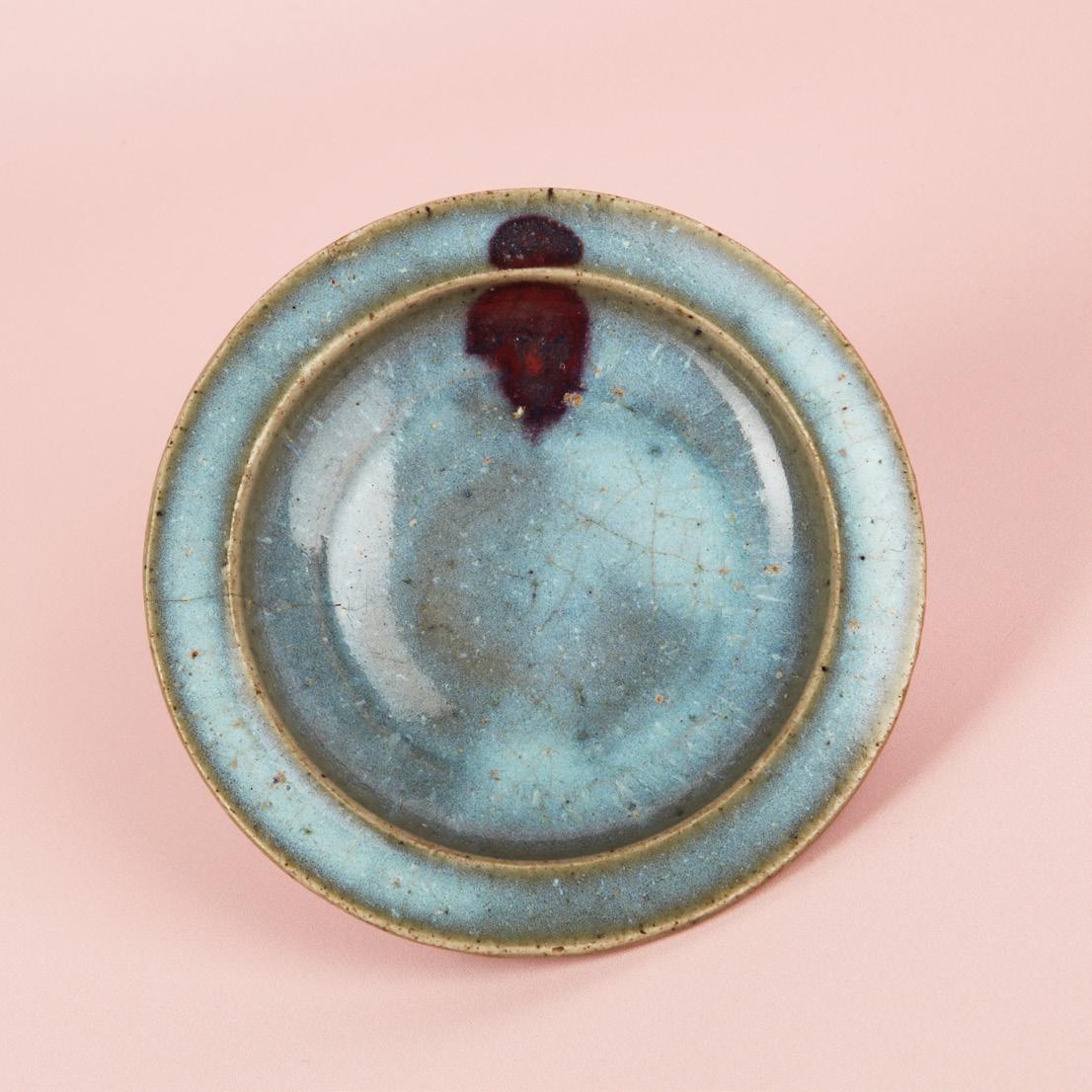 The small dish of shallow form rising from a short foot, with flared side and wide flat rim, the well of the dish and part of the rim decorated with a purple-spash, overall covered with a sky-blue glaze thining at the edges revealing the pale body underneath the glaze, the glaze stopping short of the foot, revealing the unglazed body on the underside. 11.5cm diameter