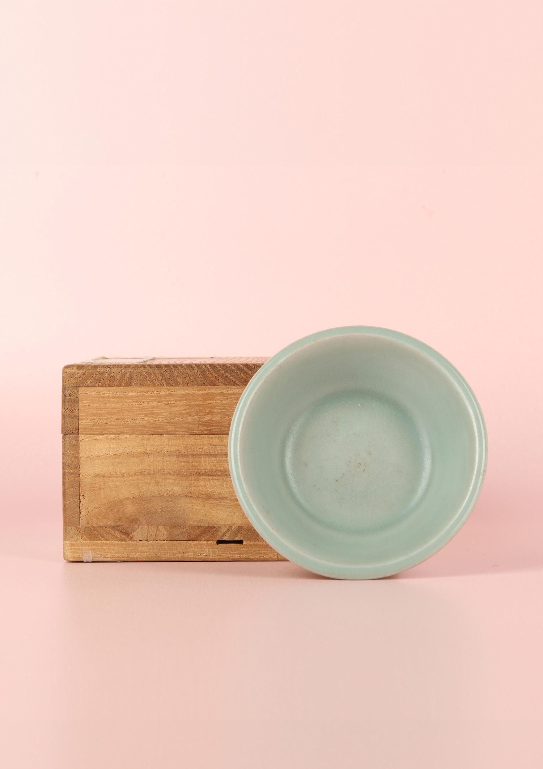 The small and finely potted washer of shallow form, rising from a low tapered foot and with flaring sides to an everted rim, overall covered in a translucent sea-green glaze that stops neatly at the foot reveleaving the grey body, together with a japanese wood box and cover (tomobako).