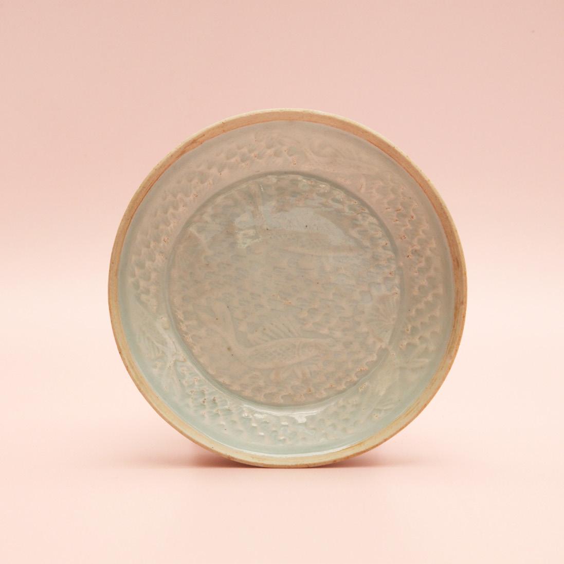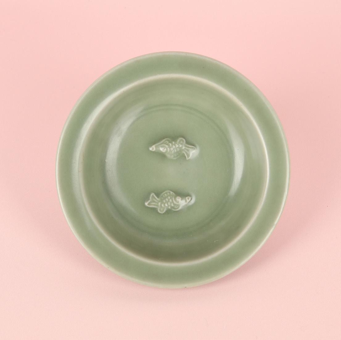 The finely potted dish or washer of shallow form, with slightly flared sides, the interior moulded to the well and rim with fishes swimming against a current, overall covered with a pale blue-green glaze stopping short of the rim revealing the white body. 14cm diameter