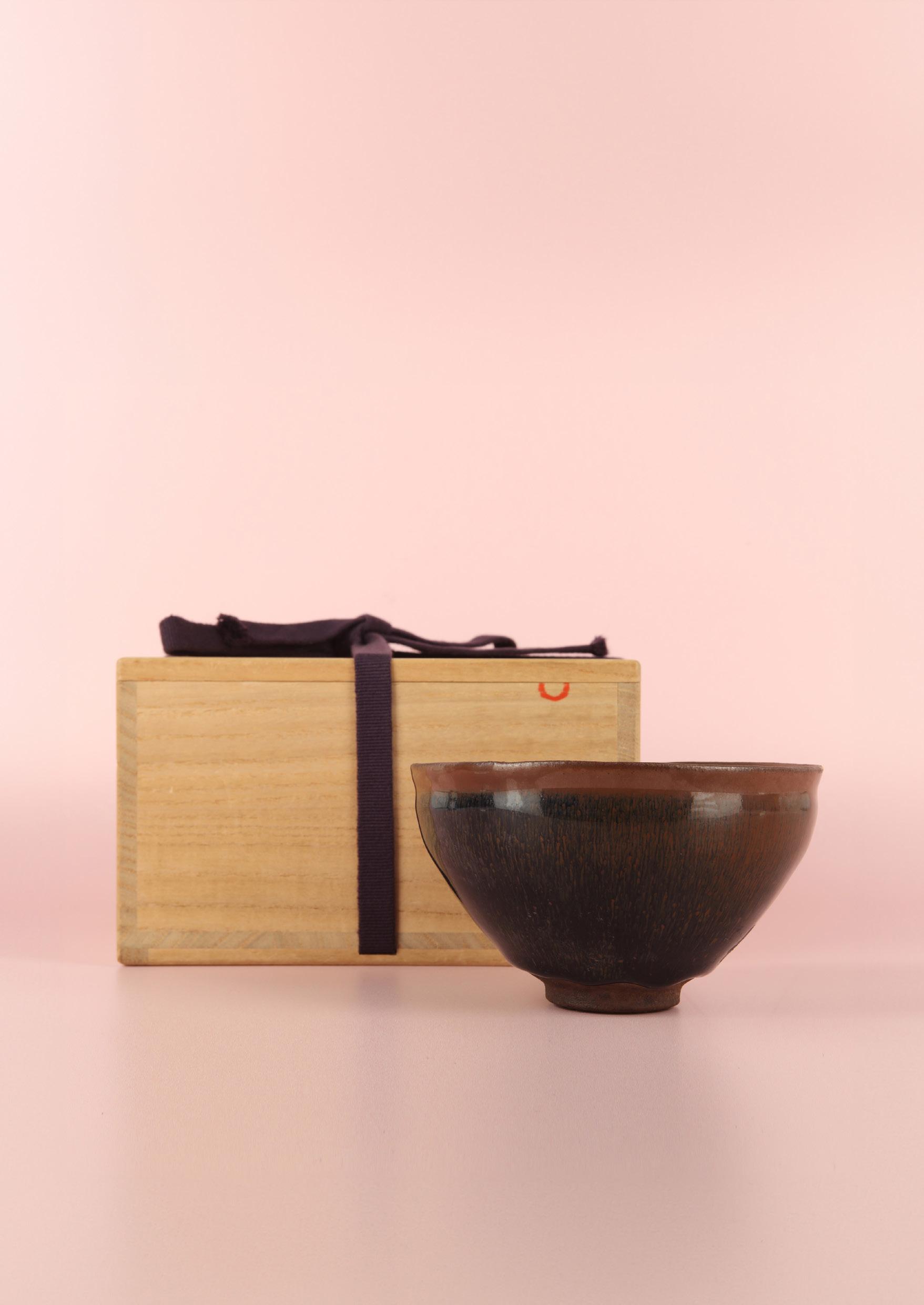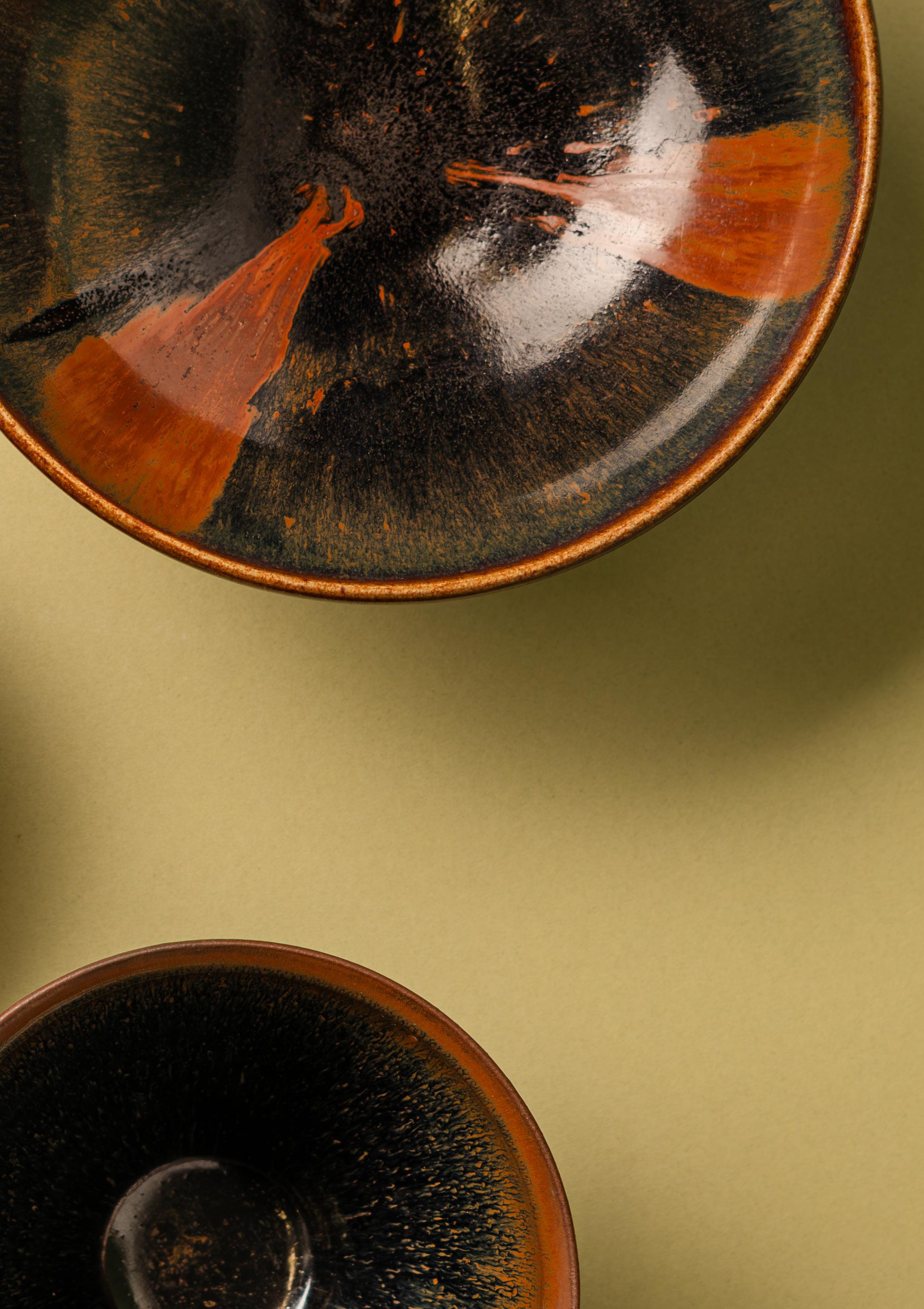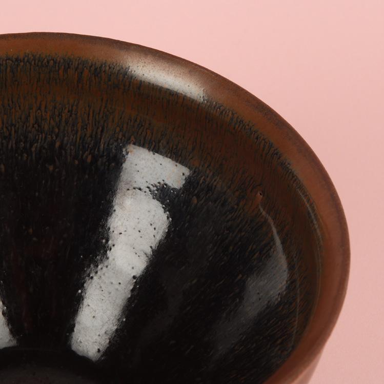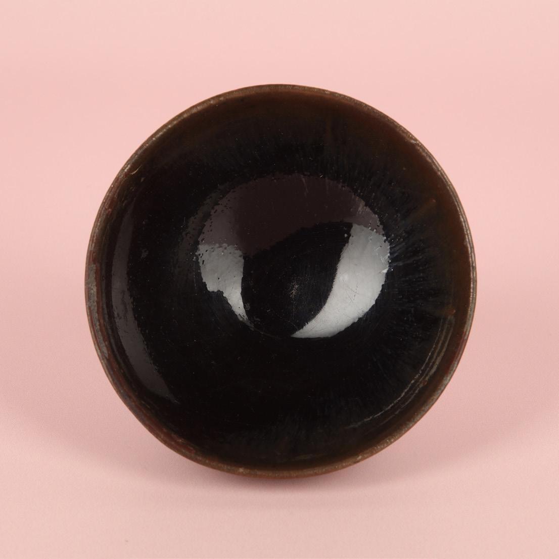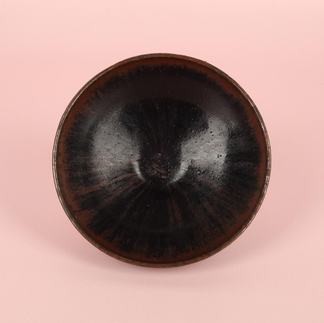 The fine and robustly potted bowl with deep sides rising to an indented rim, covered overall in a black-glaze with cascading russet 'hare's fur' streaks and pooling short of the foot, revealing the purple-tinged brown body. 12.8cm diameter