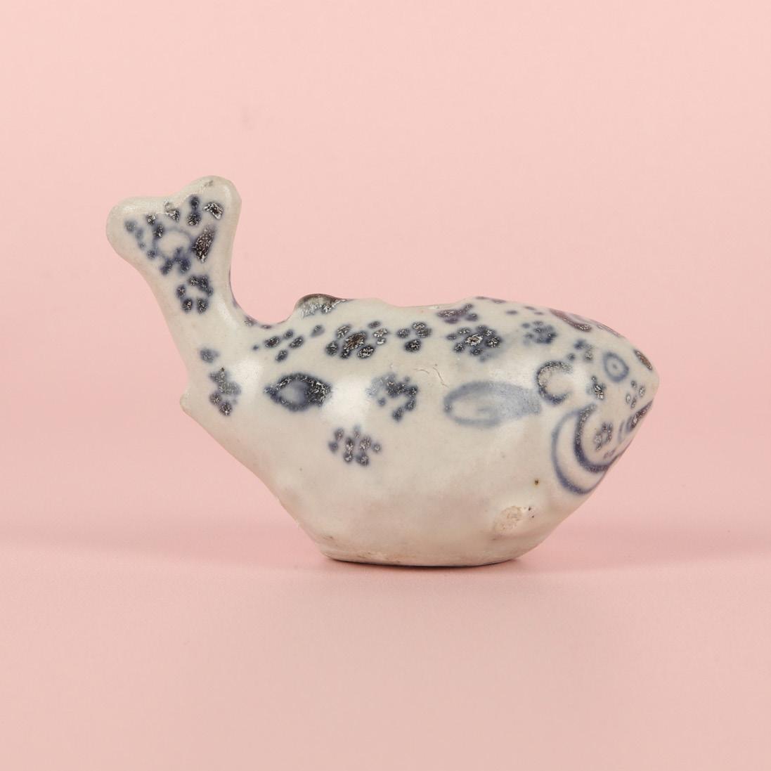 The finely potted water dropper in the form of a fish, likely a puffer fish, decorated to the exterior in underglaze blue with small opening at the top and at the mouth of the fish. 8cm wide
