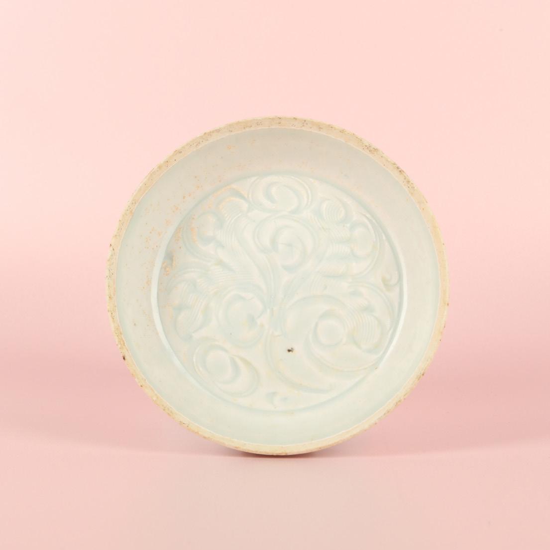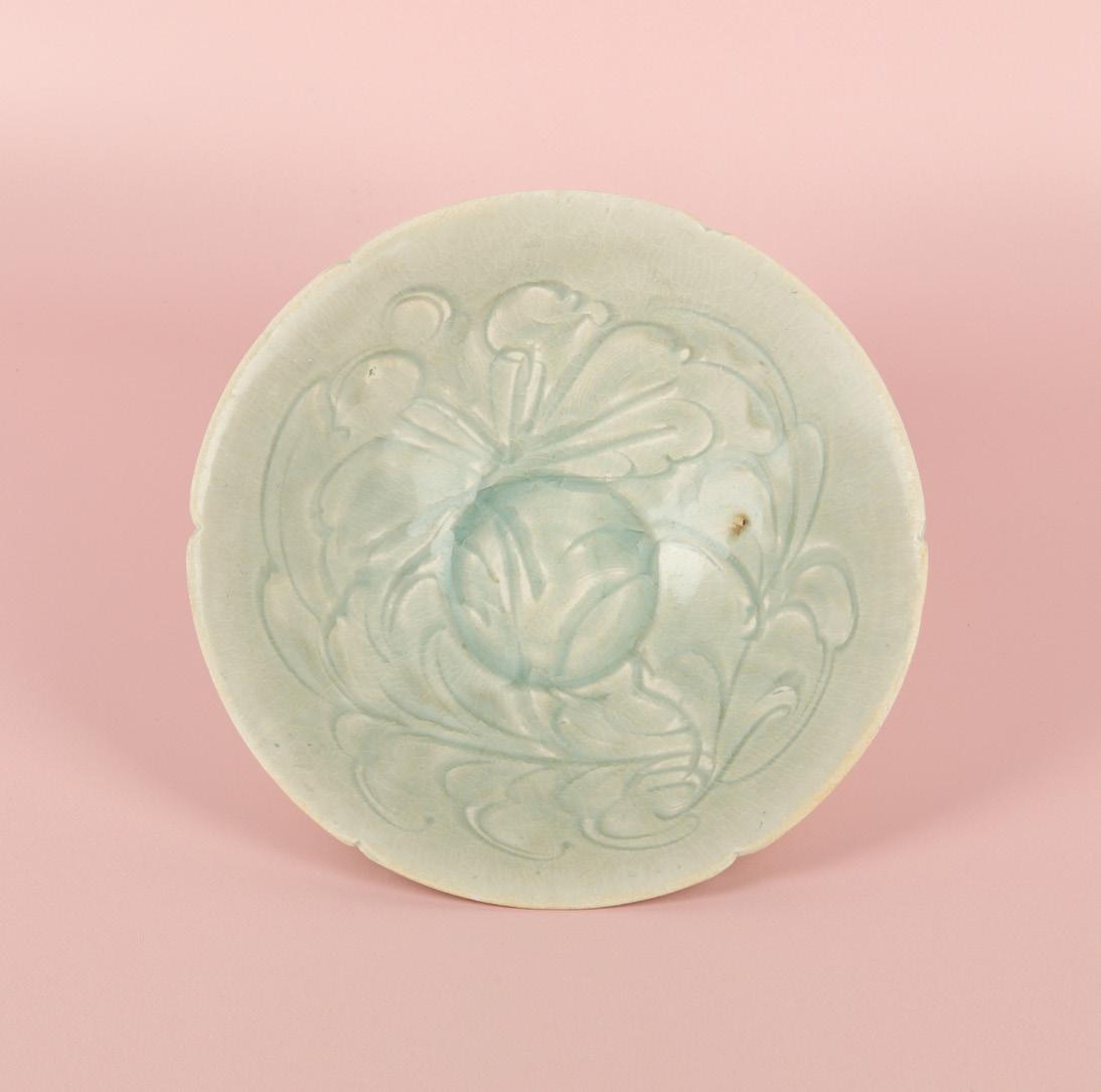 The finely potted lobed dish or washer, with a slightly flared rim, the interior carved with a stylised design of lotus flowers to the well, overall covered with a pale blue-green glaze stopping short of the rim revealing the white body. 13.7cm diameter