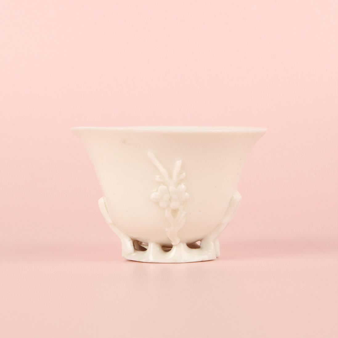 The finely potted libation cup of oval form and everted rim, supported by prunus branches forming the base of the cup, on the sides with moulded prunus decoration. 8cm wide, 5cm high