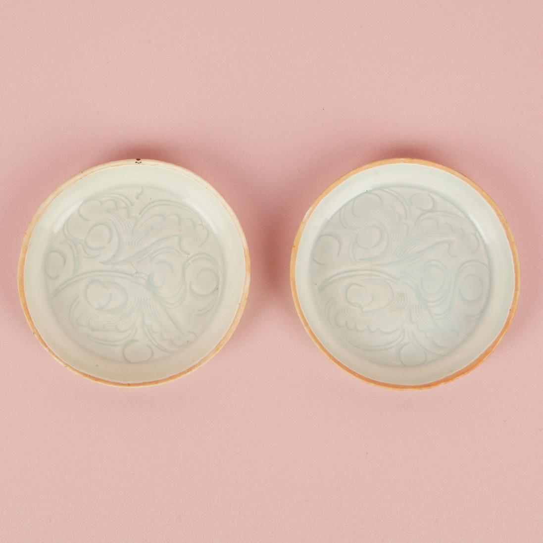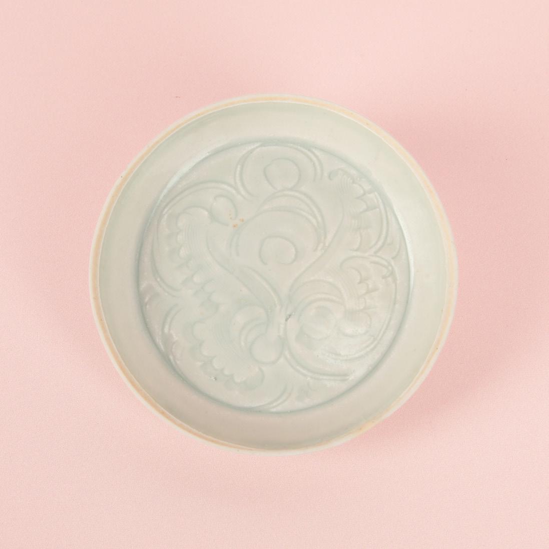 The finely potted dish or washer of shallow form, with slightly flared sides, the interior carved with a stylised lotus pattern to the well, overall covered with a pale blue-green glaze stopping short of the rim revealing the white body. 10.5cm diameter