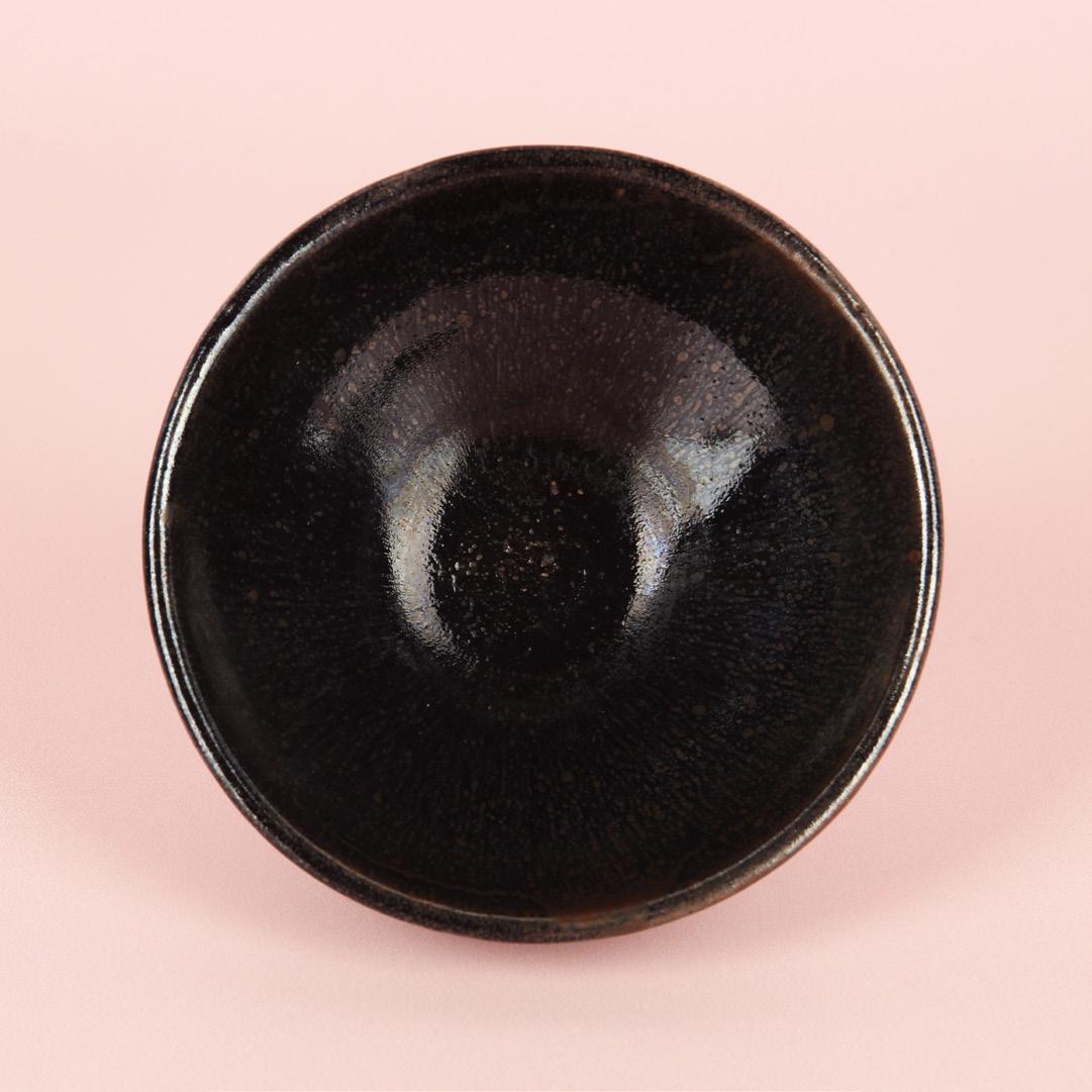 The robustly potted bowl of small proportion, rising from a short foot, covered overall with a glossy black-glaze stopped short of the foot revealing the exposed clay body. 9.2cm diameter