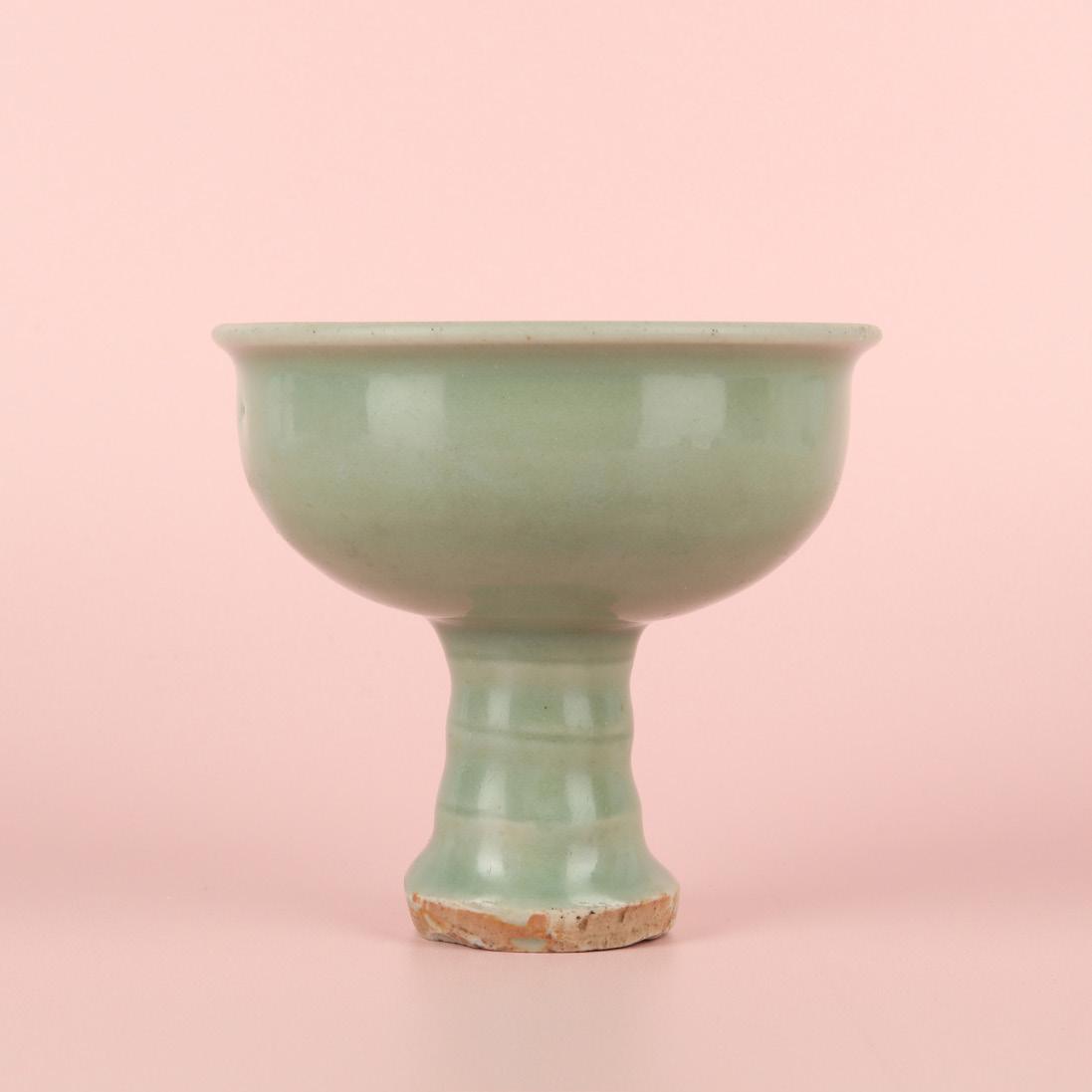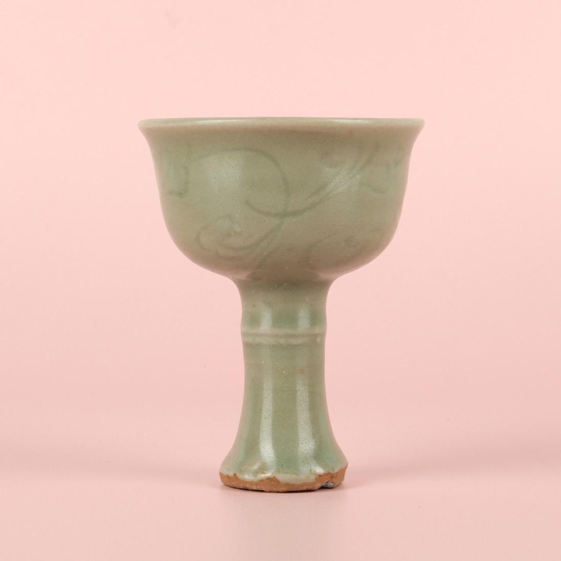 The finely potted stem cup of small proportions, rising from a tall, ribbed stem foot with rounded sides rising to a slightly everted rim, carved on the interior with scroll work and on the exterior with stylised floral sprays, overall with a lustrous sea-green glaze.