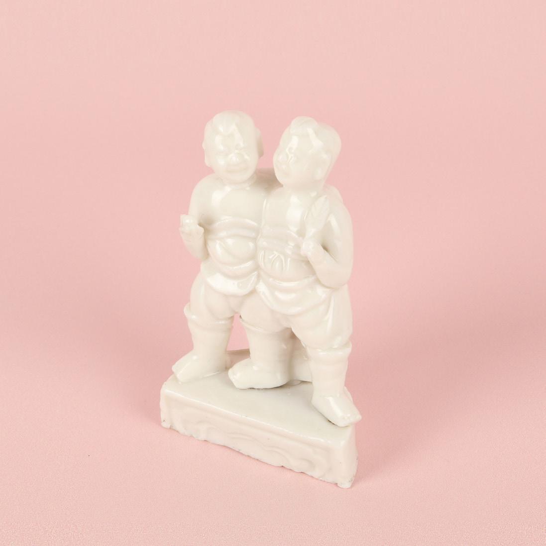 The finely modelled group depicting the 'hehe erxian' twins standing atop a table-form base, one clutching a feather in his hand.