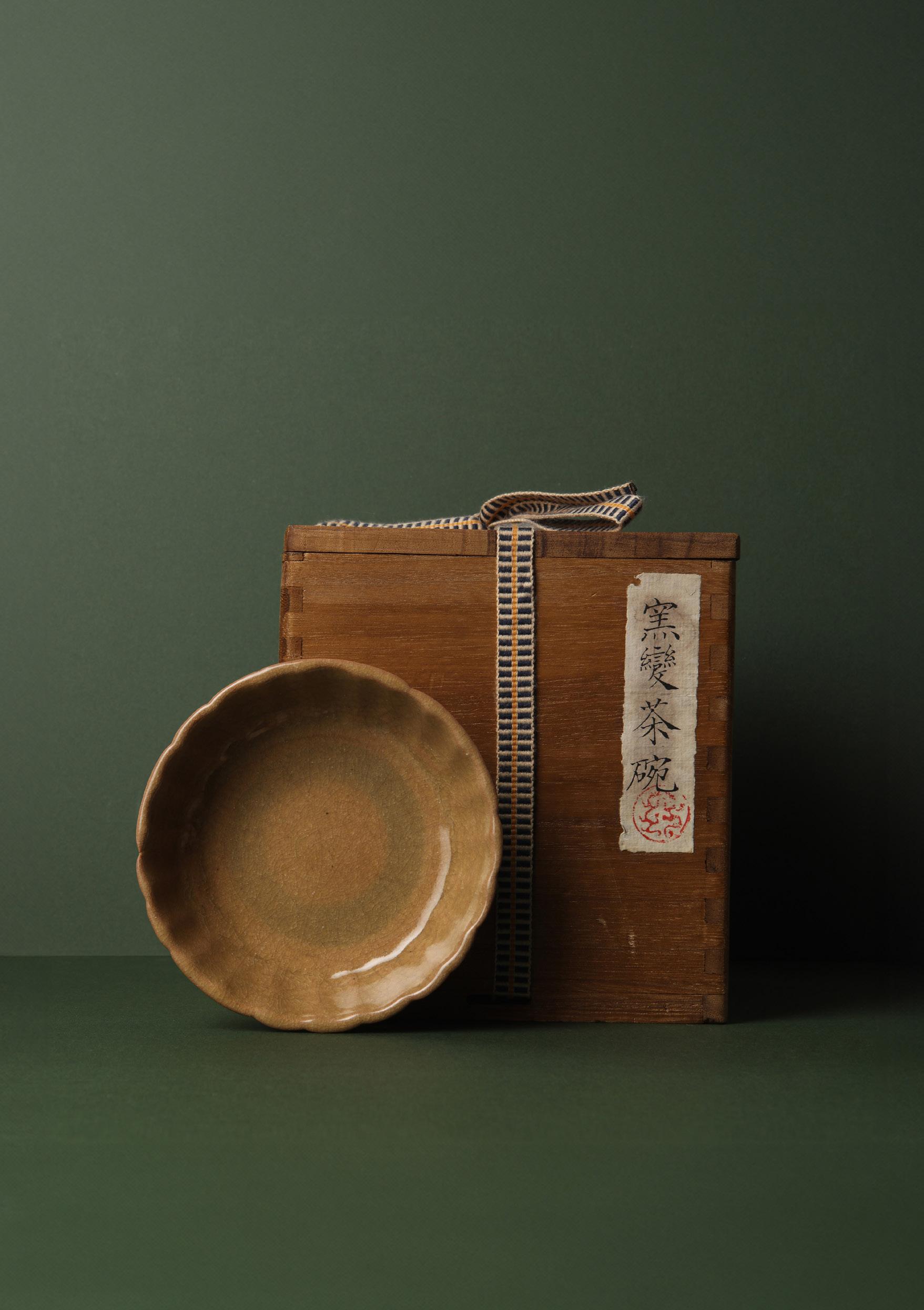 The finely potted dish of shallow form, the interior carved and combed with turbulent waves, the exterior decorated with a single incised line, covered overall with an attractive olive-green glaze, stopping neatly in a circle around the base exposing the body, together with a Japanese wood box and cover (tomobako). 12.5cm diameter