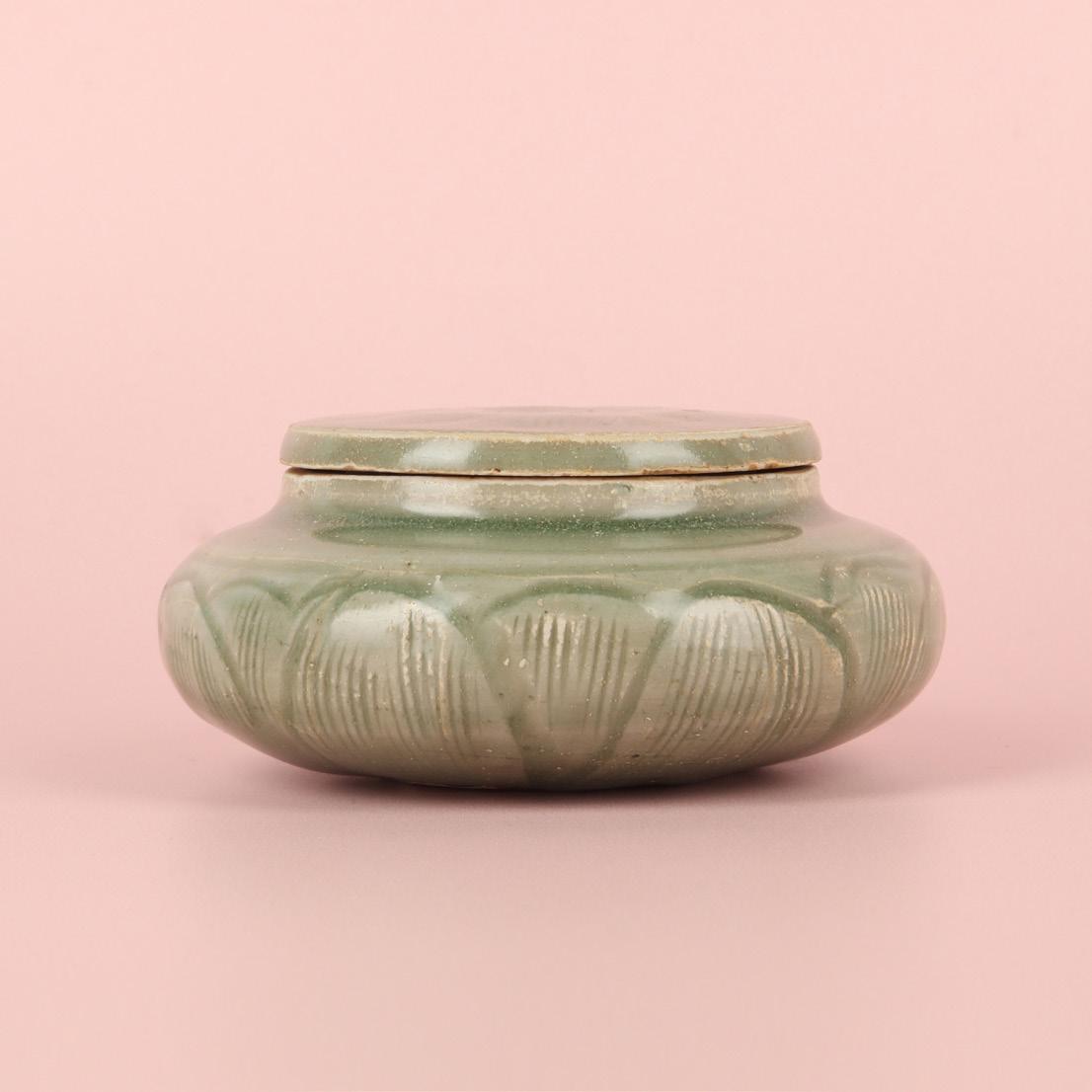 The finely potted jarlet of squat bulbous form with a flat cover, decorated to the exterior with an incised petal design and the cover depicting a large blossom, the interior of the jarlet glazed and the inside of the lid part-glazed, the underside revealing the body. 11cm diameter, 5cm high