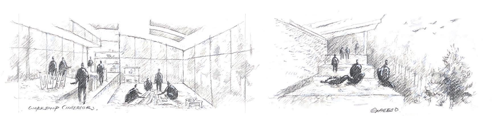 E.首先是工作室,專家及學生們坐在陽光和樹影照耀下的工作桌前,周圍擺滿了素材和模型。大家在大面落地窗和開放空間中分享想法。
