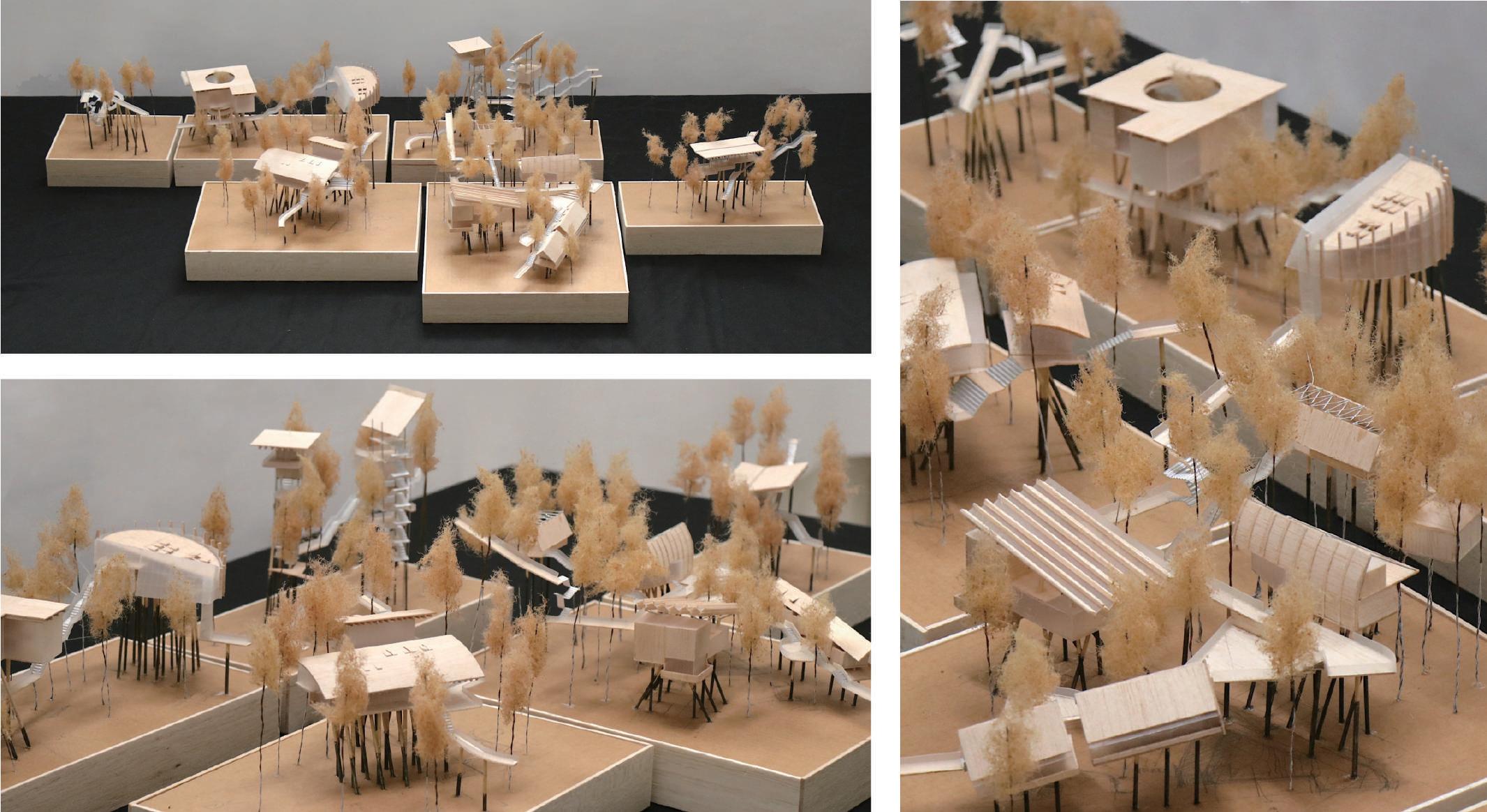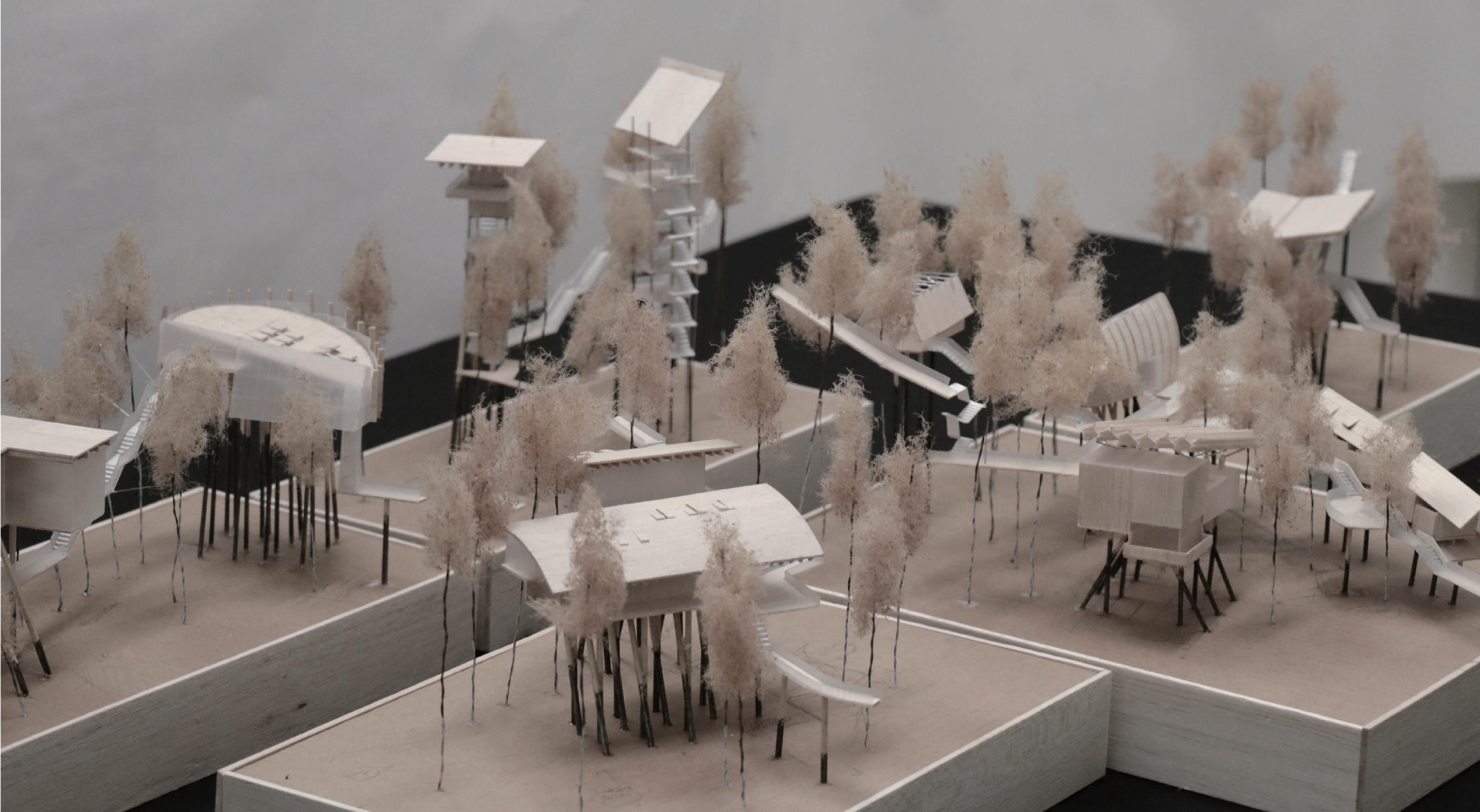 這一系列的四個研究模型展示了設計的發展脈絡。第一個模型從感官出發,思考著在這個專案中希望使用者體驗到的感受是什麼。第二個模型則將這些感受應用到環境中 ,嘗試創造一個能夠與周遭環境共生的故事。接著,透過概念圖將這些想法應用到基地上,通過考慮軸線關係來思考更抽象的概念。最後,我們將感官和概念逐步推演至 空間層面,形成了初步的設計雛形。