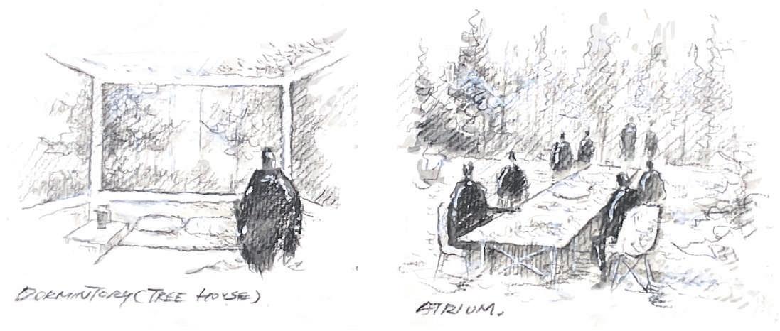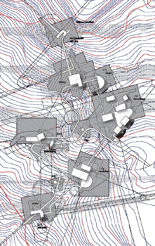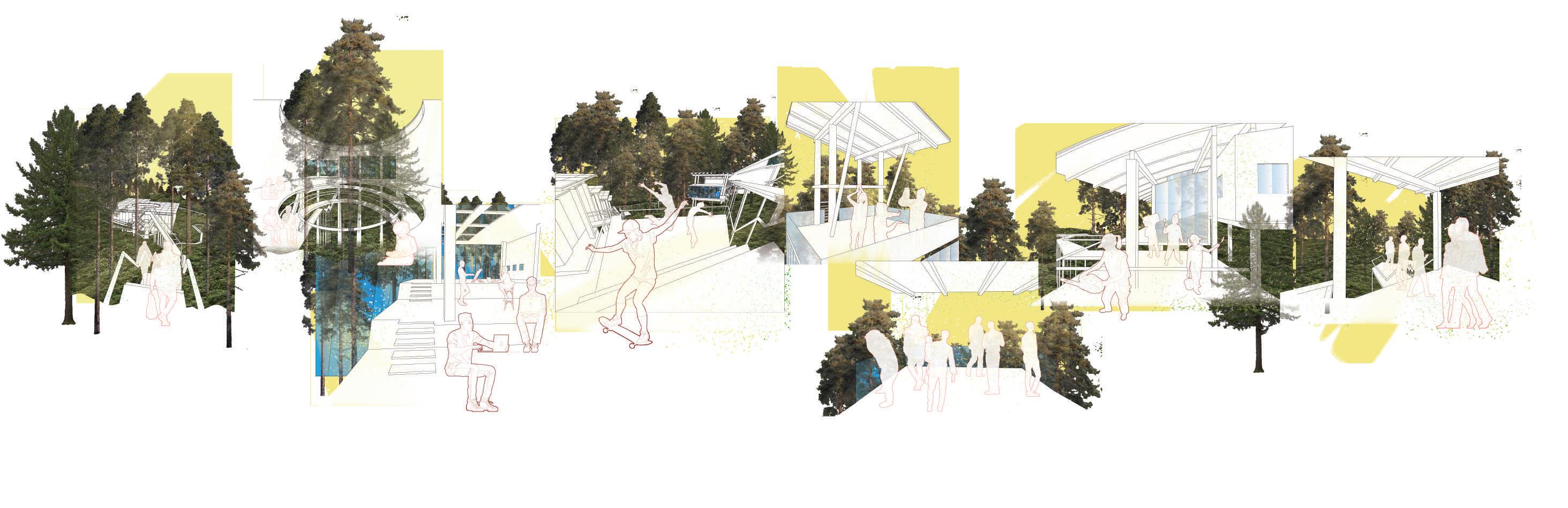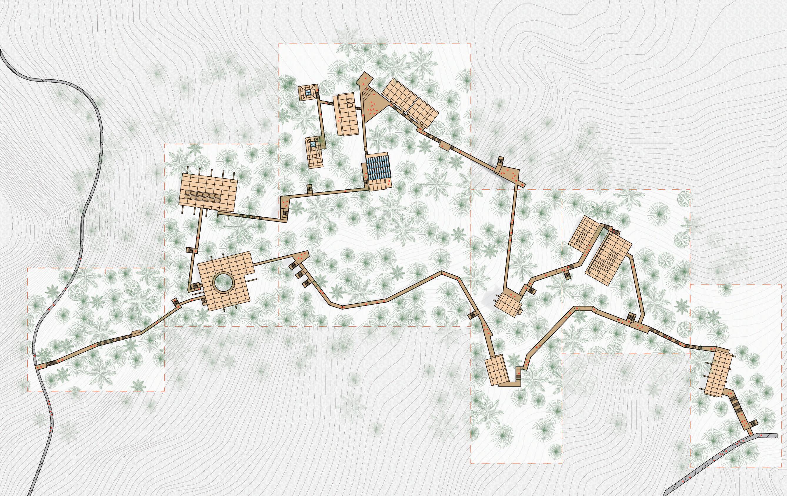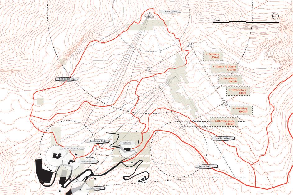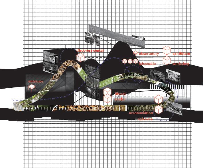 此圖展示了兩條動線的互動、建築的語彙變化和空間與環境的對話。其願景是一個與自然共生的場域,融合幾何形態和自然元素、激發 人們探索的精神。同時,這裡也吸引不同專業背景的人們研究不同的議題。這樣的環境使人 新思考與土地的關係,並從中獲得平靜與 啟發。