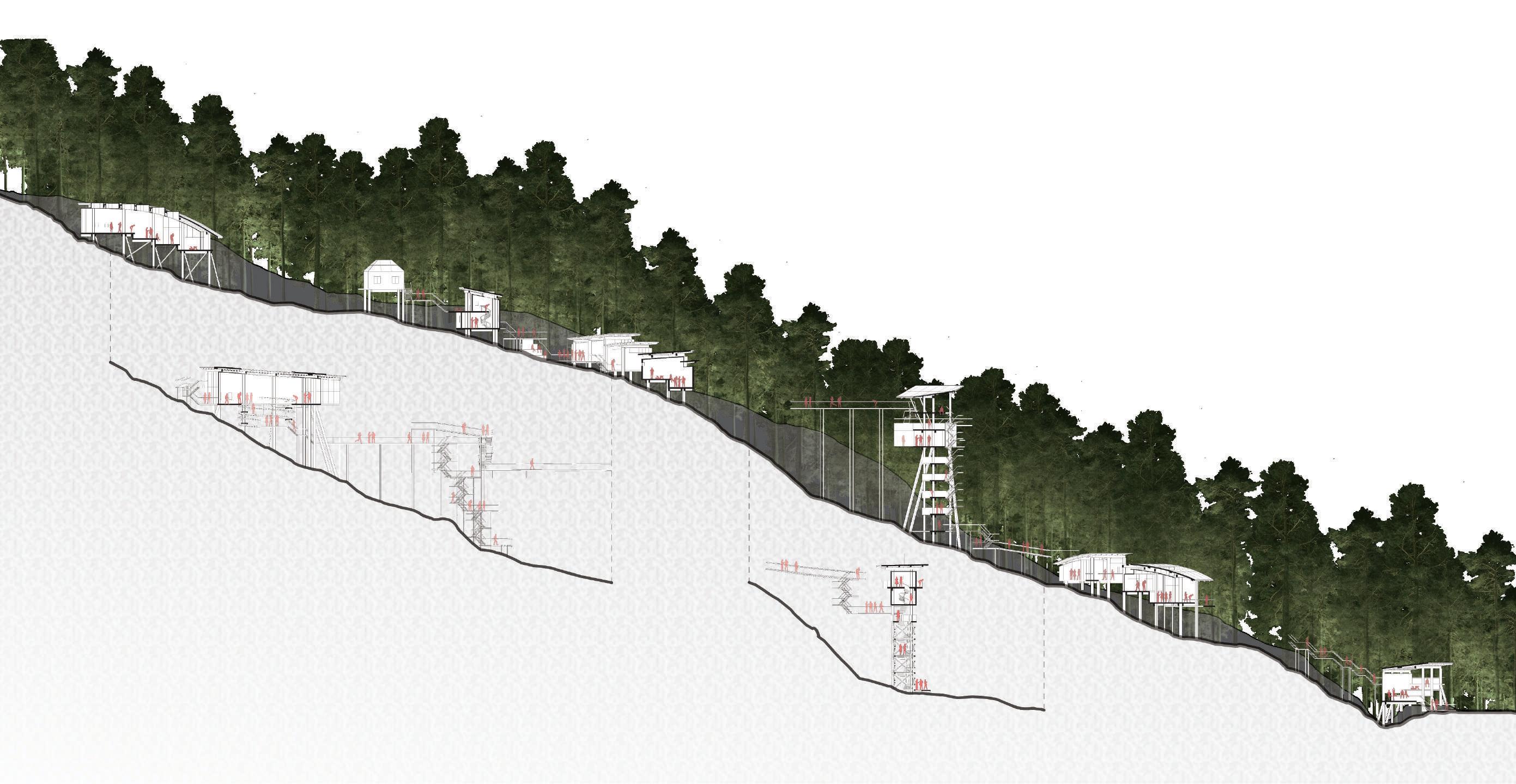 遊客中心是脫離城市的標的也是探索的起點,在森林中的 驗性建築學校則是將探索過程 踐的機會。而藉由一個「體驗導向」的探索 場域作為載體, 新討論「探索」對於我們的意義。人對於一個場所的經驗取決於感知,對於環境的感知則取決於空間。因此在這個設 計中,我希望透過東眼山特殊的定位以及山林中的幕幕場景,使人們在遊走於建築與大自然中時,對於探索的詮釋能夠油然而生。