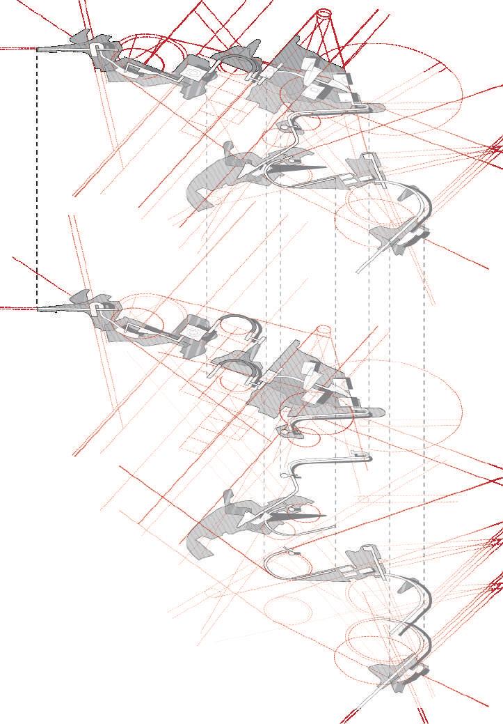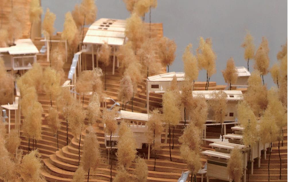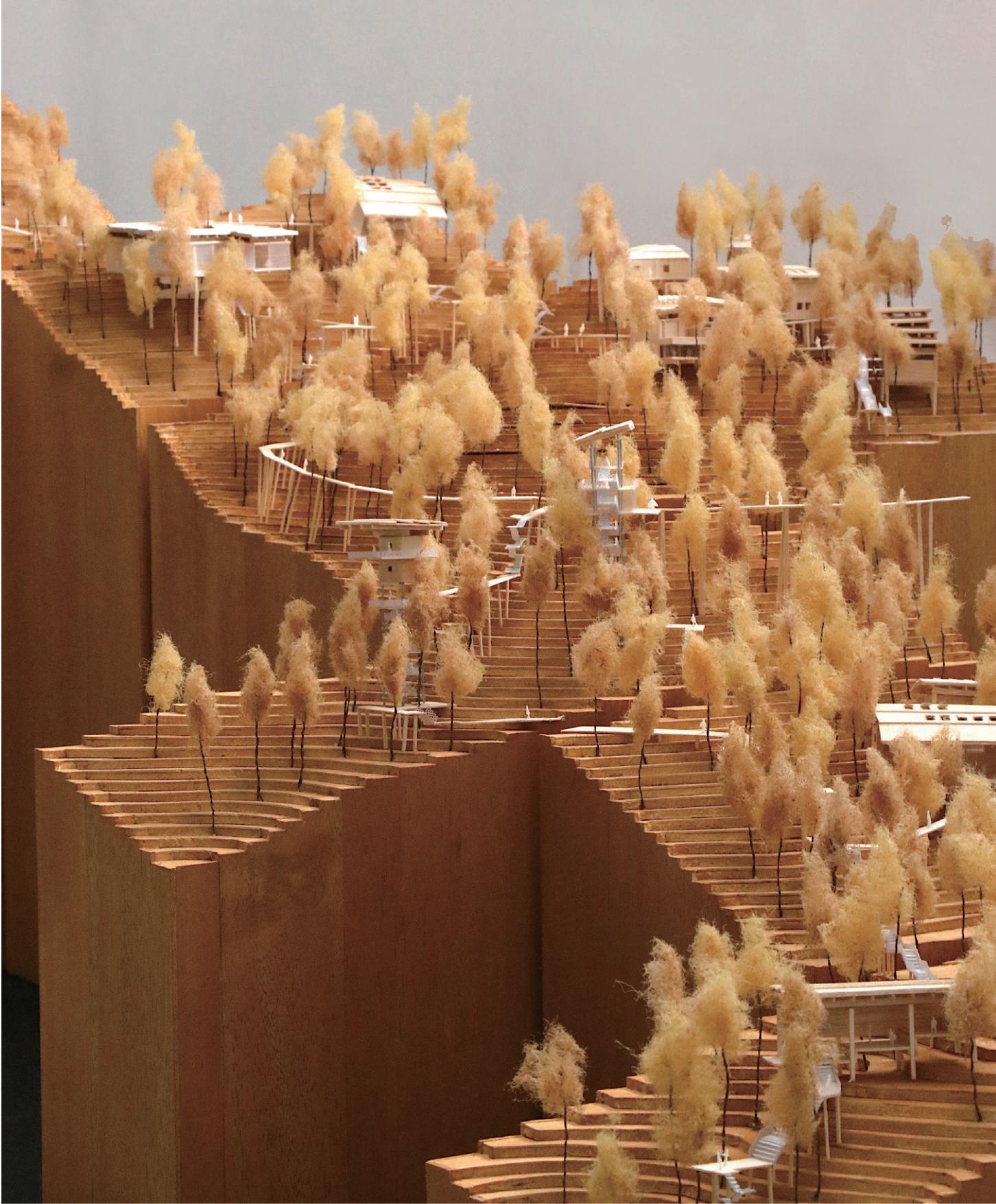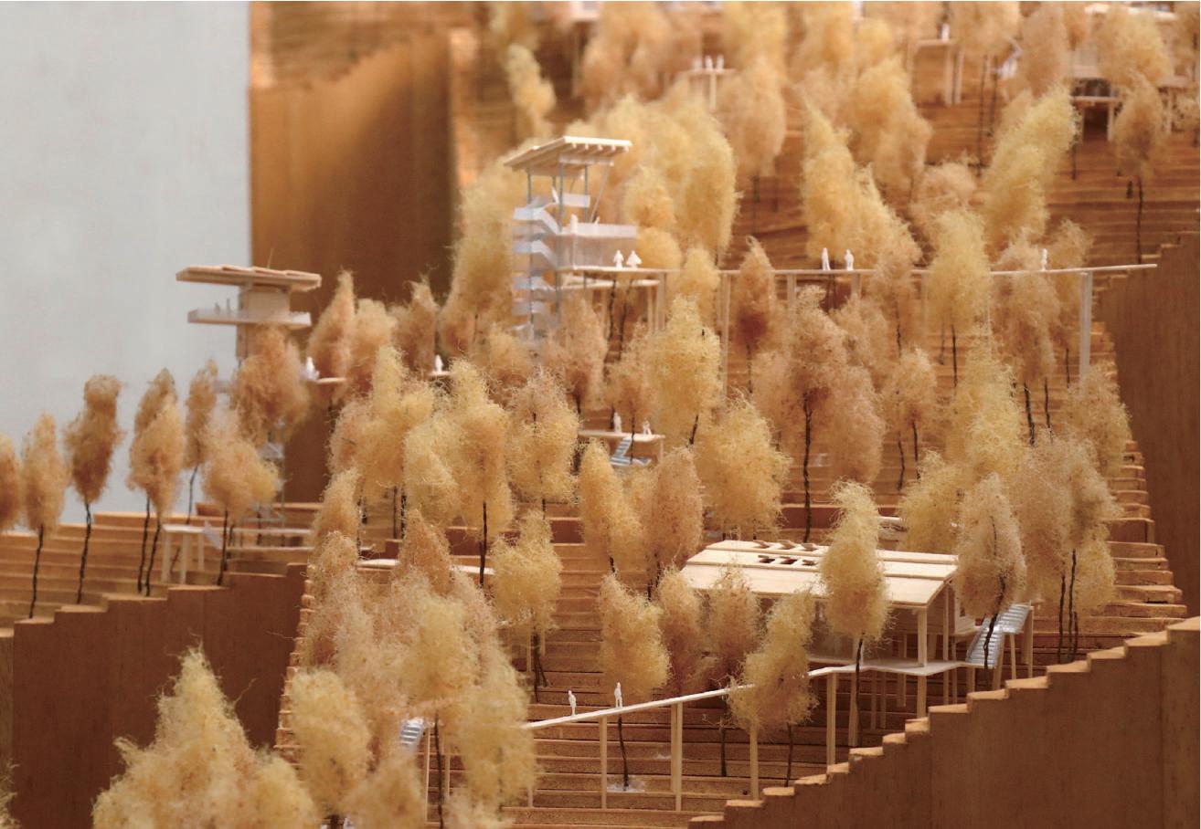 係,整體層面是整個設計與樹木之間的關係。以微觀的角度,能觀察到步道不僅是作為動線而存在,它 際上是整個場域中調節體驗節 奏的 要元素之。當人們在步道上遊走時,不同角度和高度變化以及它所連接的室內外變化使整個體驗變得豐富而流暢。