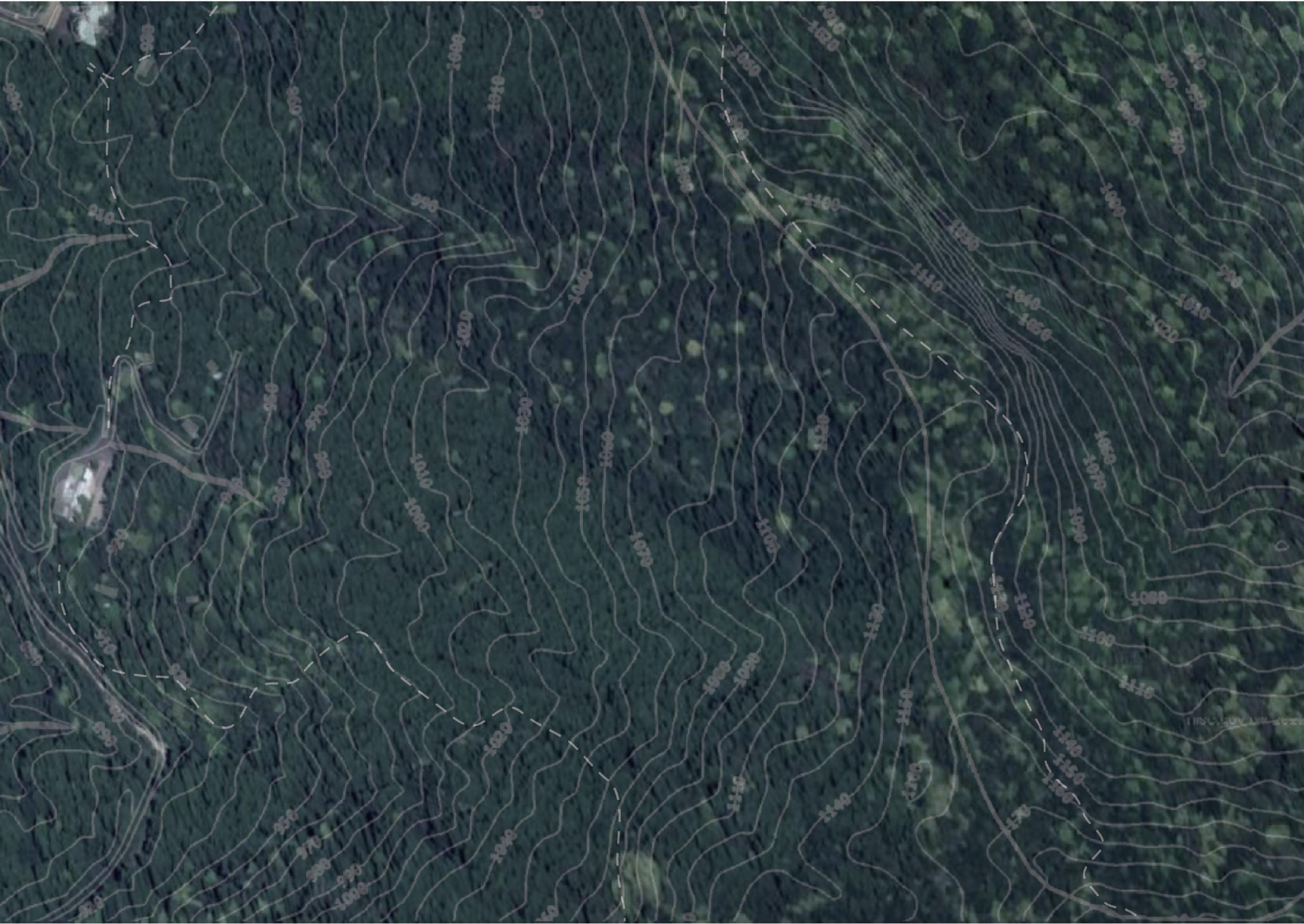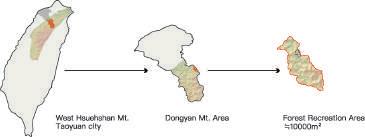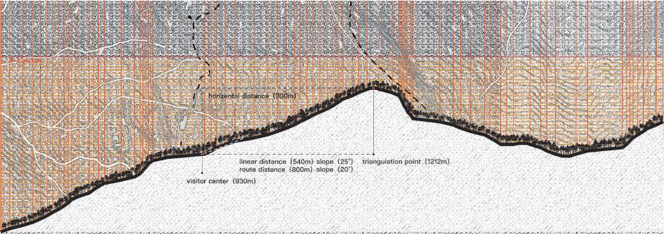 fig04: 此圖示為後來於園區中所選定的範圍。在整個區域內,挑選較陡峭步道的下山路徑作為探索場域的起點、較平緩的步道則作為終點。 在這段長度橫跨500米、高度差將近200米的範圍中,是東眼山森林遊樂區中柳杉覆蓋率高的區域,而使用者便能輕易的沈浸其中,並在垂直與水平的三維向度中體驗探索 的樂趣。